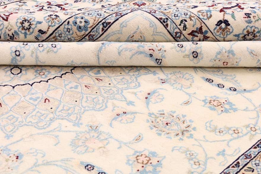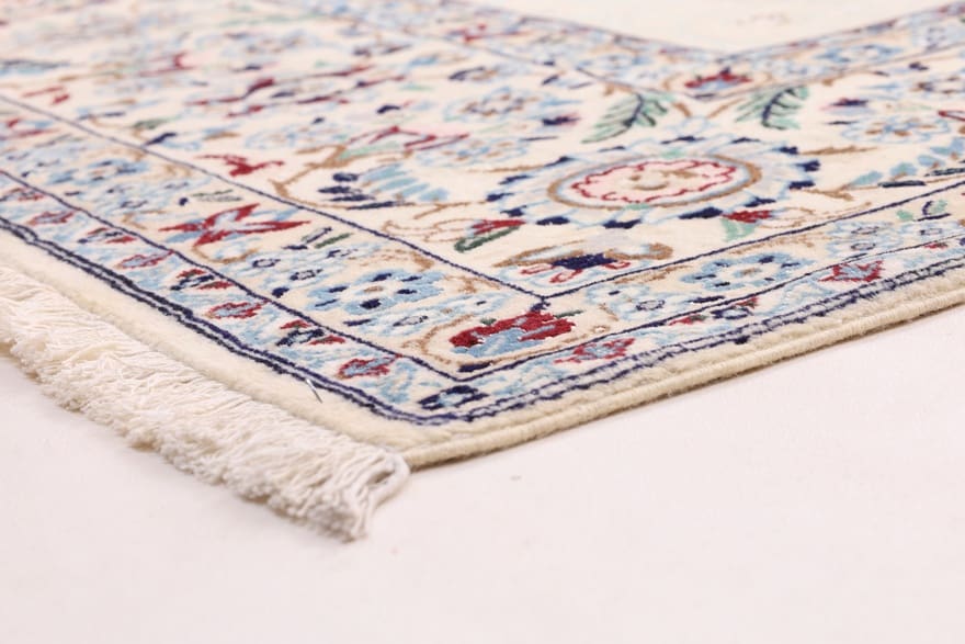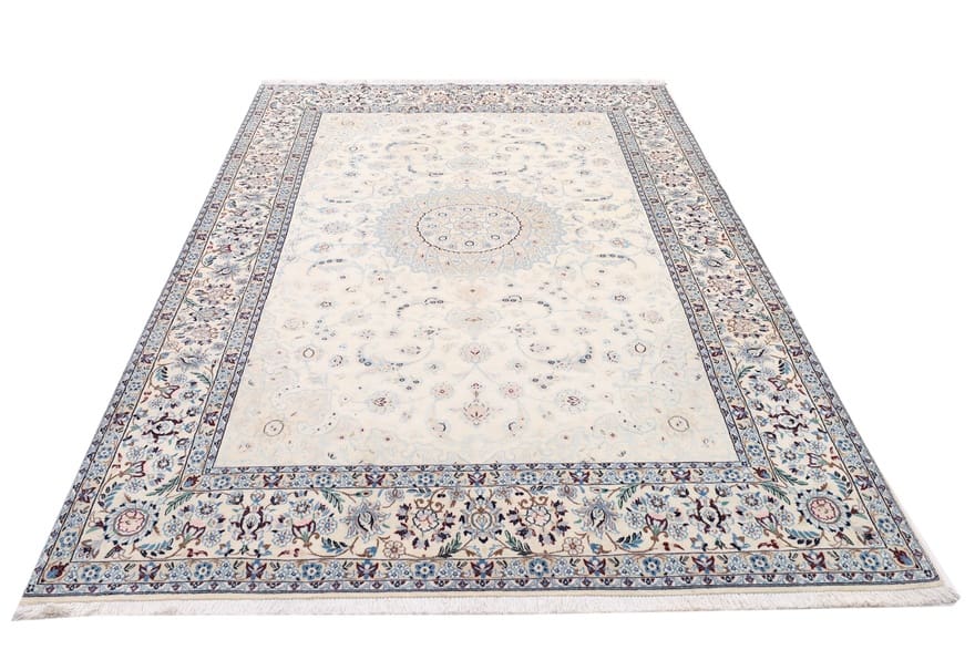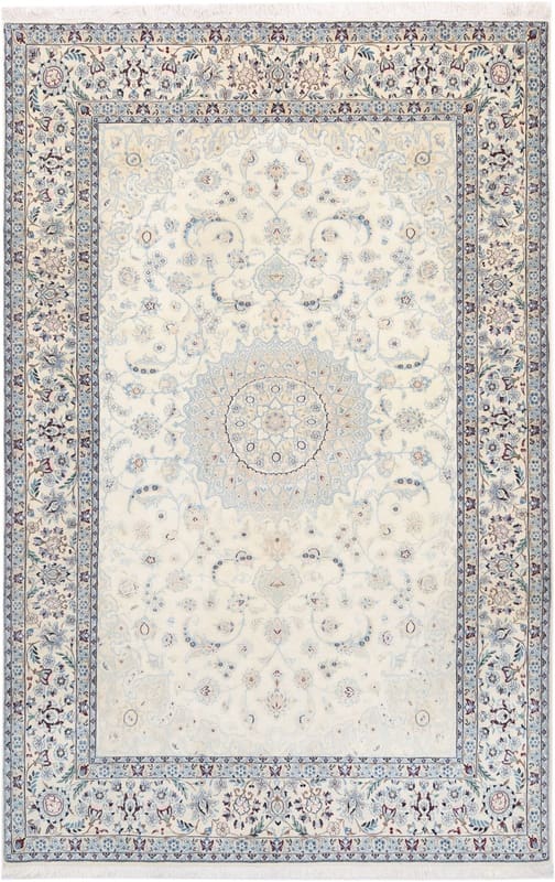 Handgefertigter Nain 9 La Teppich | Knotendichte: 320.000 – 360.000 Knoten/m² | Material: Wolle und Seide | Größe: 312×201 cm | Farbe: Weiß/Beige | Zustand: Neu | Herkunft: Iran/Persien | Gewicht: ca. 18 kg | Verarbeitung: Handgeknüpft | Form: Rechteckig | Dicke: ca. 8 mm