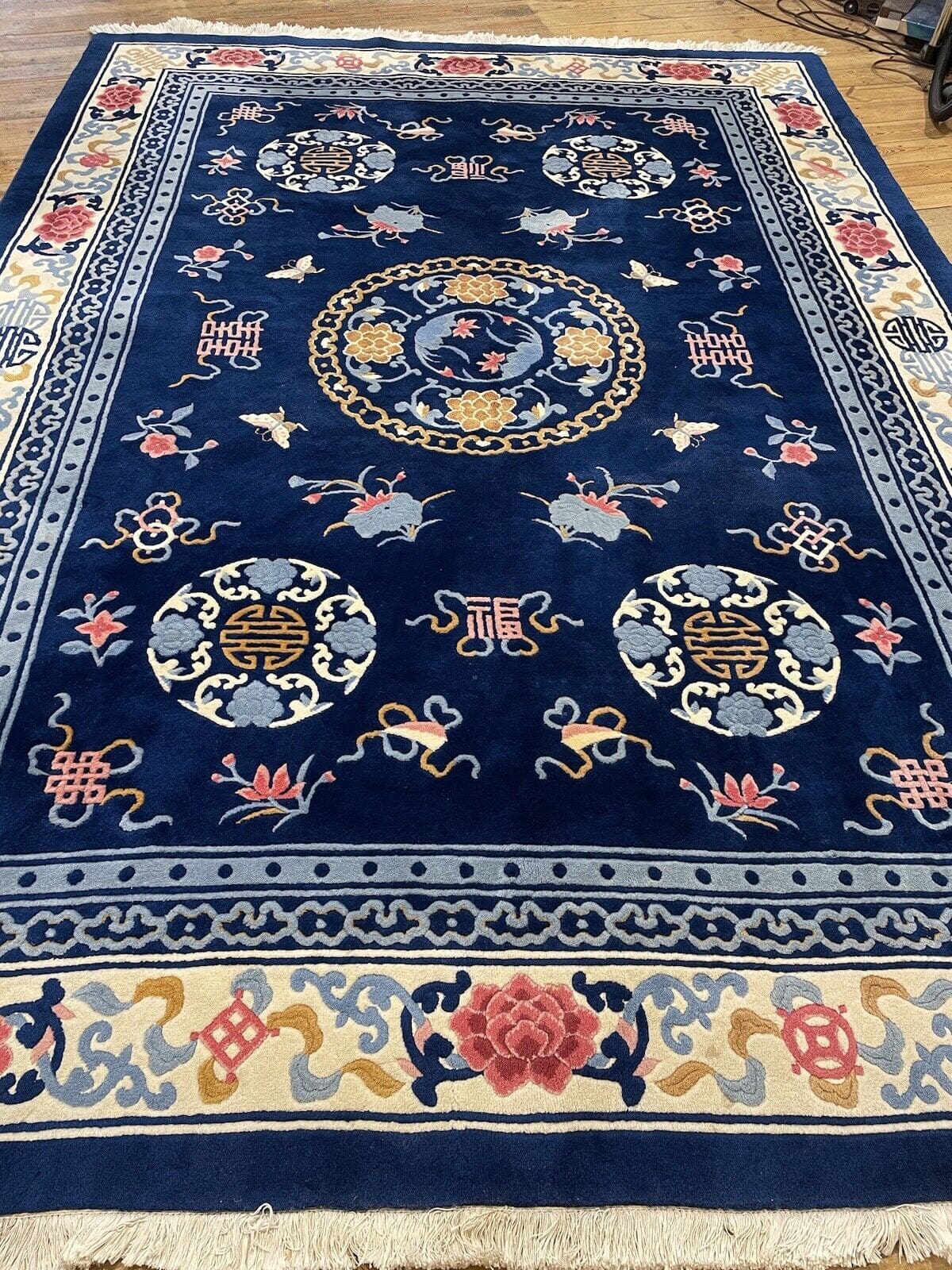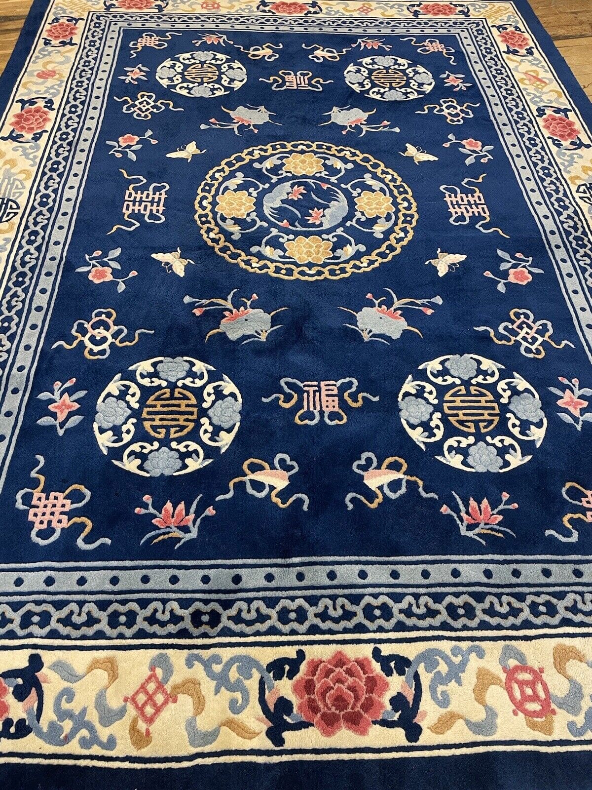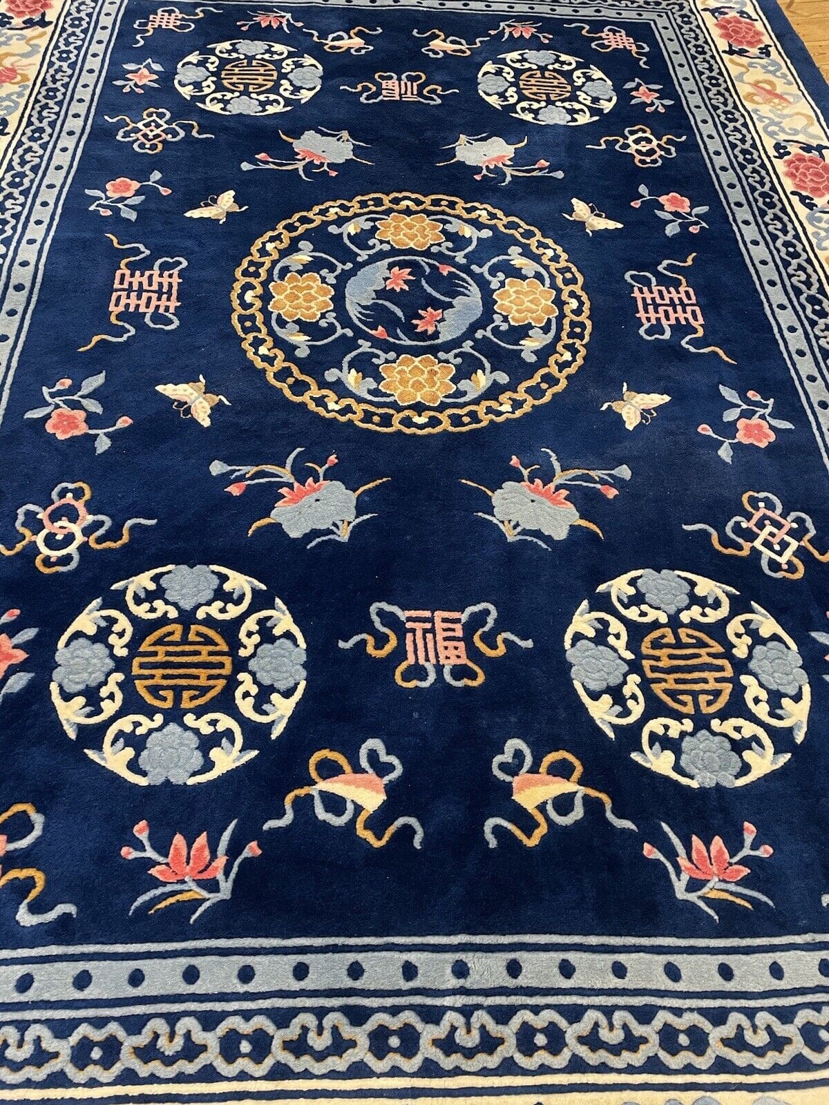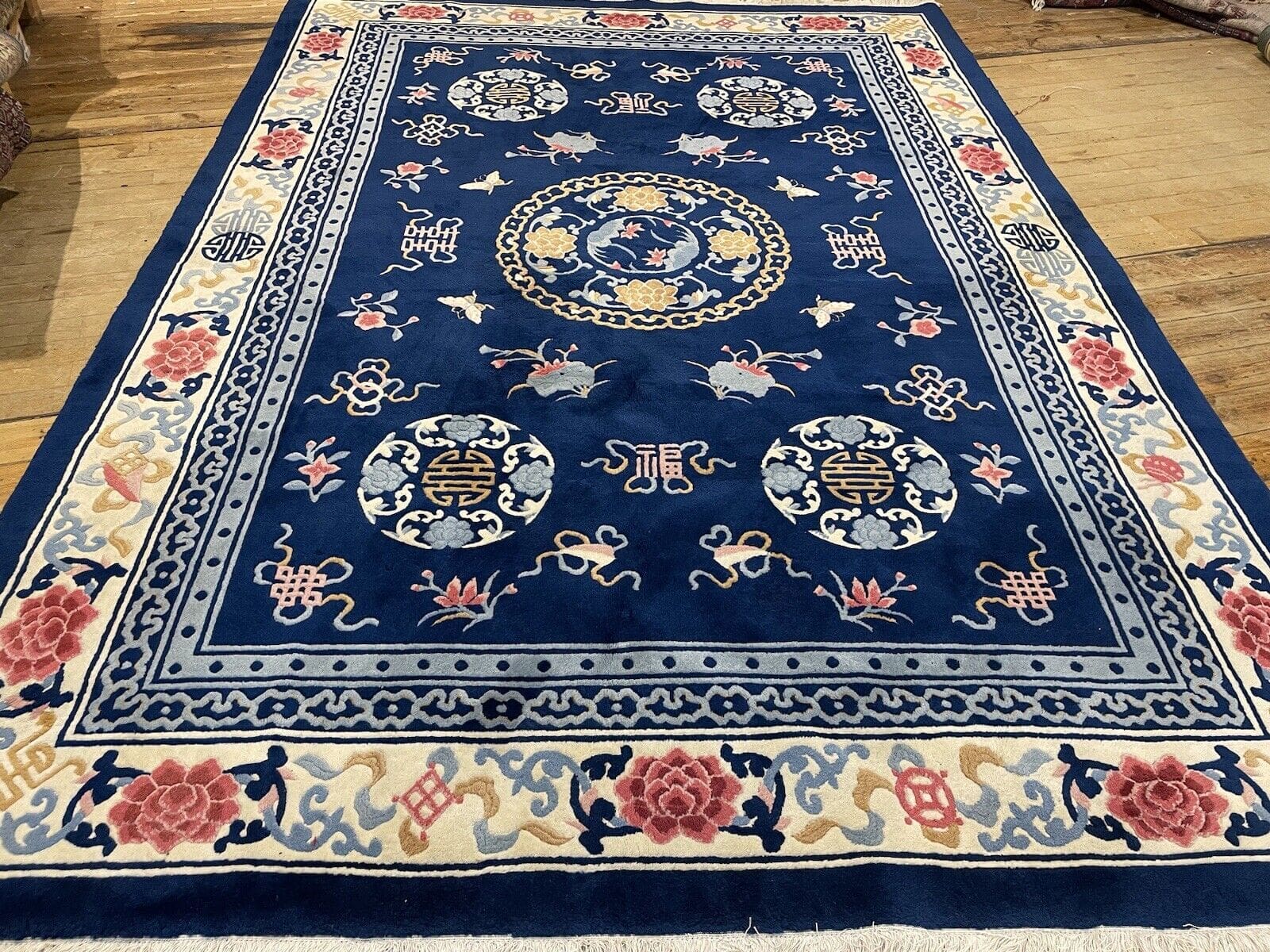 Handgeknüpfter Peking Teppich | Größe: 250 x 350 cm | Material: Hochwertige Wolle und Baumwoll-Kettfaden | Florhöhe: 7 mm | Epoche: Frühes 20. Jahrhundert (1911-1940) | Zustand: Gebraucht, in gutem Zustand | Design: Seltenes, klassisches Muster | Für Fußbodenheizung geeignet | Ideal für Schlafzimmer, Esszimmer und Wohnzimmer | Farbe: Blau