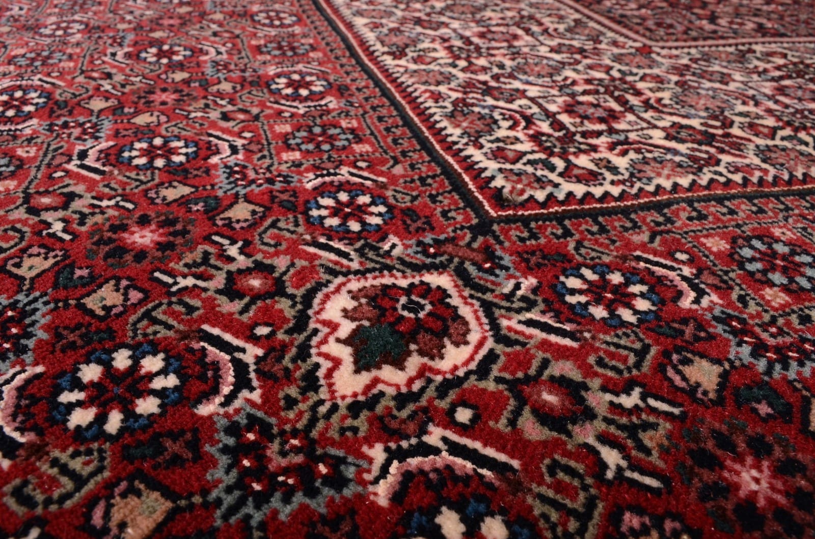 Mit 300.000 Knoten ist dieser Teppich ein Paradebeispiel für hochwertige Handarbeit. Die hohe Knotendichte sorgt für ein besonders detailreiches und nuanciertes Muster, was diesen Teppich in seiner Klasse hervorhebt. Der Zustand des Teppichs ist als hervorragend zu bewerten und garantiert daher eine lange Lebensdauer. Darüber hinaus bietet der Bidjar eine beeindruckende Strapazierfähigkeit – ideal für stark frequentierte Bereiche im Wohnraum. Neben der funktionellen Qualität ist dieser Teppich eine Bereicherung für jedes Zuhause und kann in unterschiedlichen Einrichtungsstilen kombinert werden, von klassisch bis modern.