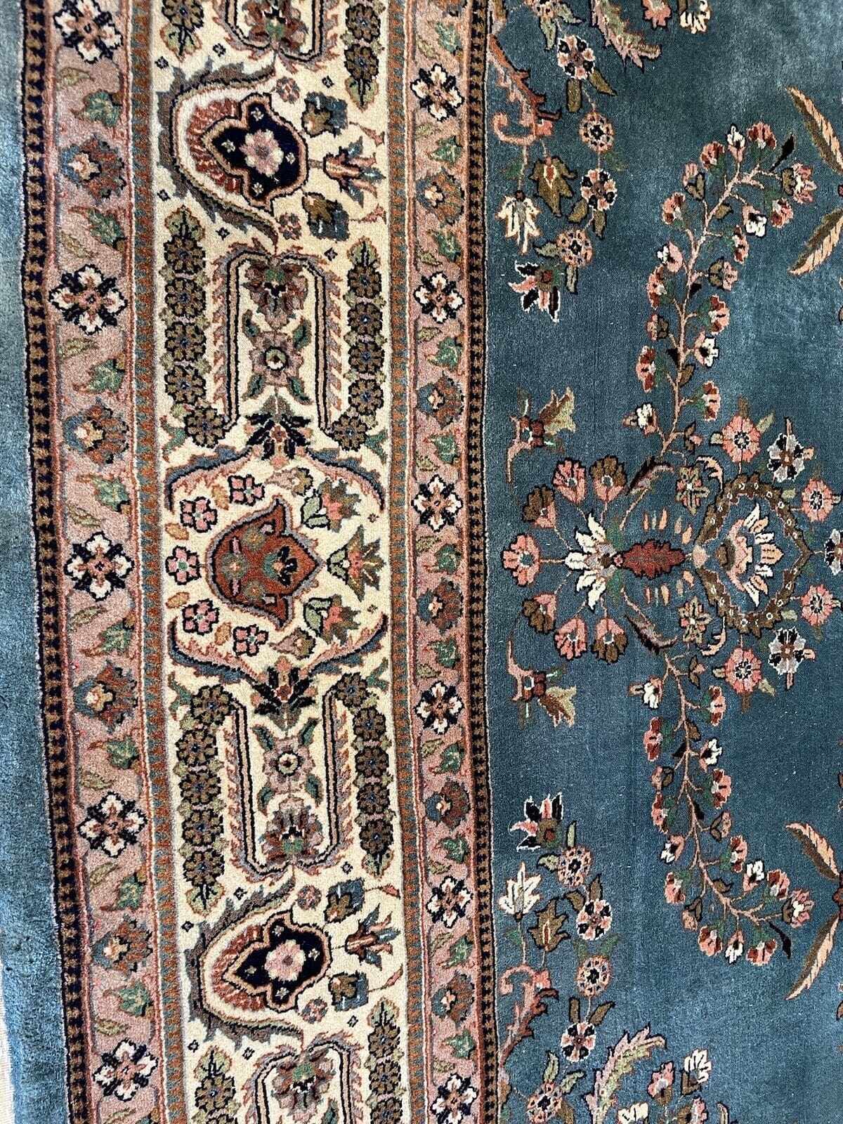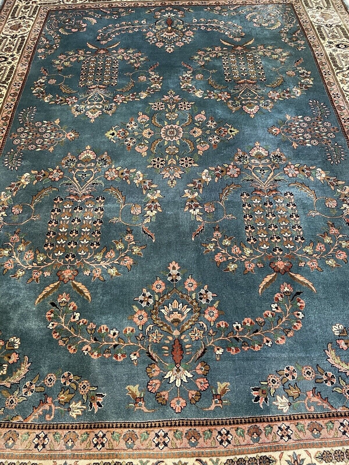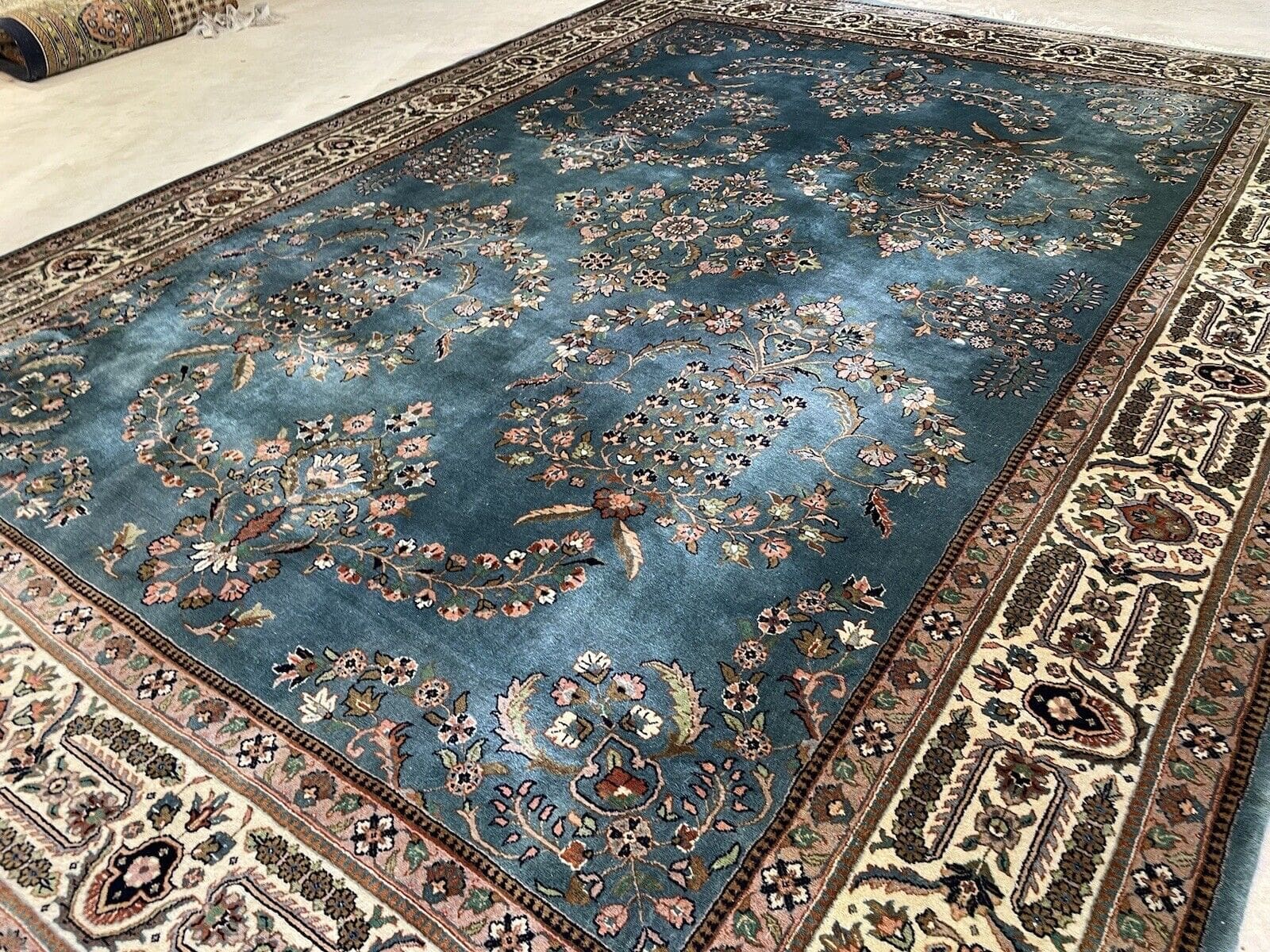 Feinster handgeknüpfter Tabriz Kaschmir Teppich in Blau Petrol – 335×250 cm, 500.000 Knoten, moderne Blumenmuster, reine Schurwolle, handgeknüpft, Perserteppich