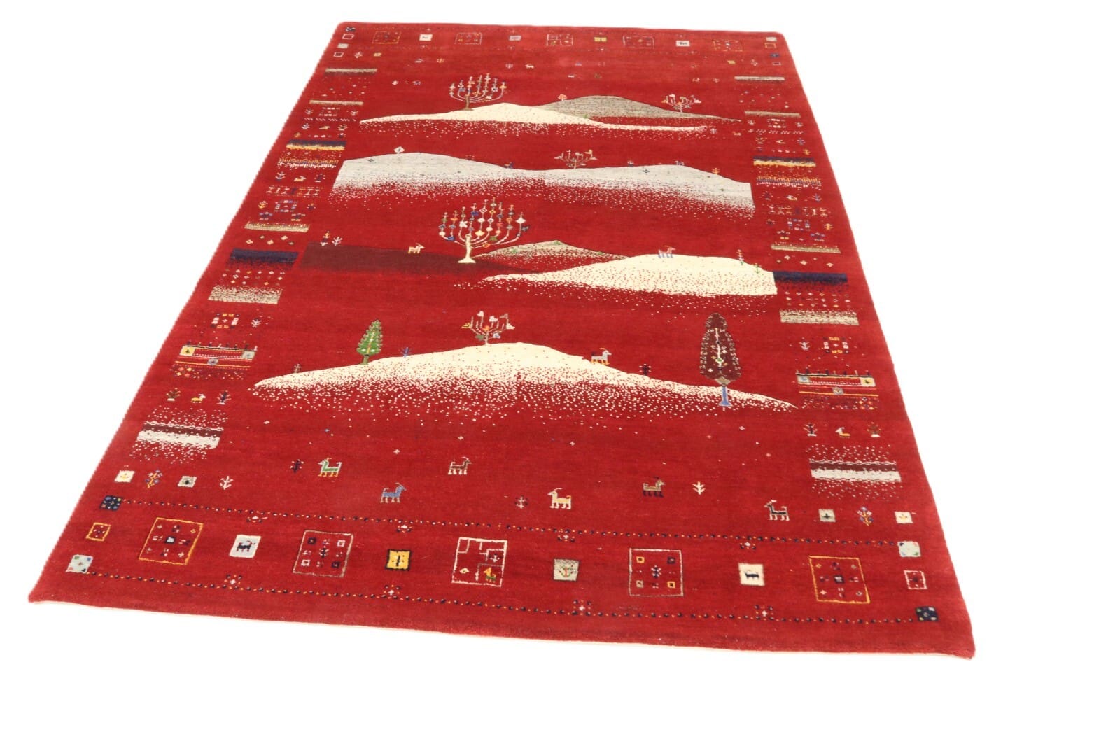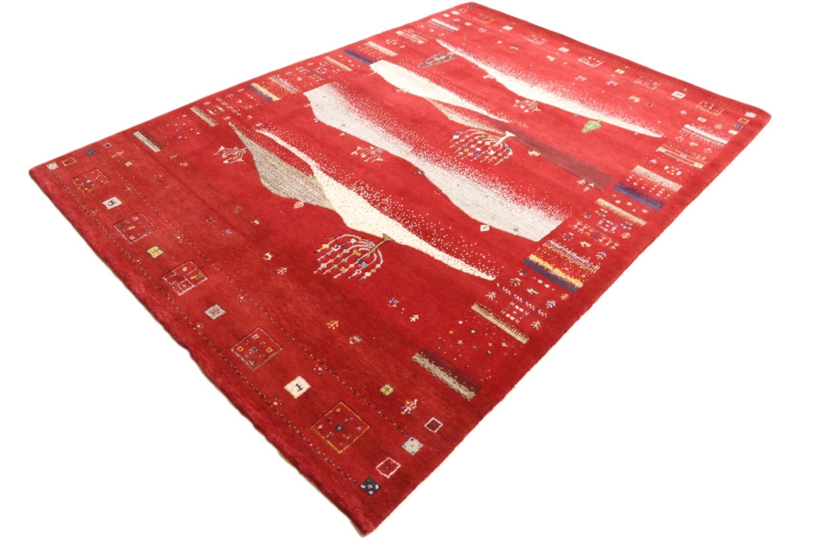 Gabbeh-Teppiche stammen aus der Region Persien, die für ihre reichen Teppichtraditionen bekannt ist. Der Begriff „Gabbeh“ bezieht sich auf eine spezielle Art von Teppich, die typischerweise in ländlichen Gebieten Irans erzeugt wird. Diese Teppiche sind oft weniger kompliziert im Design und zeichnen sich durch lebendige Farben und geometrische Muster aus, die die kulturelle Identität und das tägliche Leben der nomadischen Völker widerspiegeln.