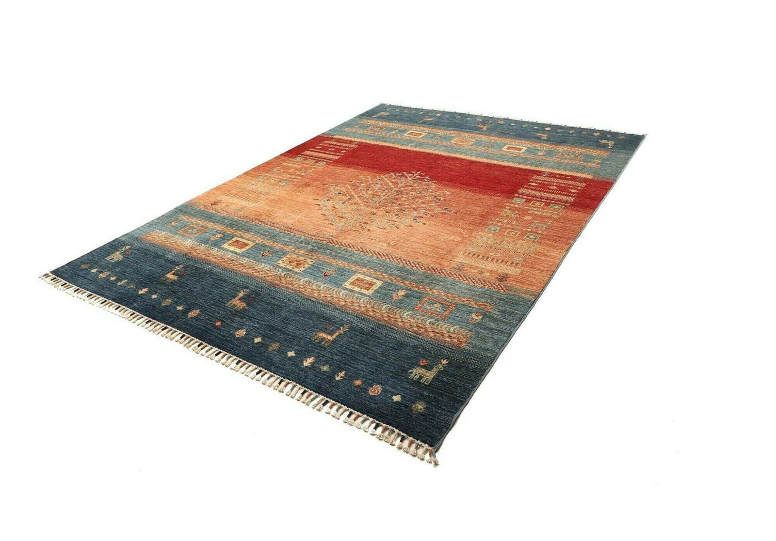 Der Teppich wird aus 100% Schurwolle gefertigt, was ihn nicht nur besonders weich, sondern auch langlebig und robust macht. Schurwolle ist ein traditionelles Material, das für seine hervorragenden Eigenschaften bekannt ist: Sie ist schmutzabweisend, strapazierfähig und hat natürliche isolierende Eigenschaften. Die Verarbeitung dieses Teppichs erfolgt in Handarbeit, wodurch jeder Gabbeh Teppich ein Unikat darstellt. Die Knotentechnik sorgt dafür, dass die Muster und Farben lebendig bleiben und sich das Material optimal an die Umgebung anpasst.
