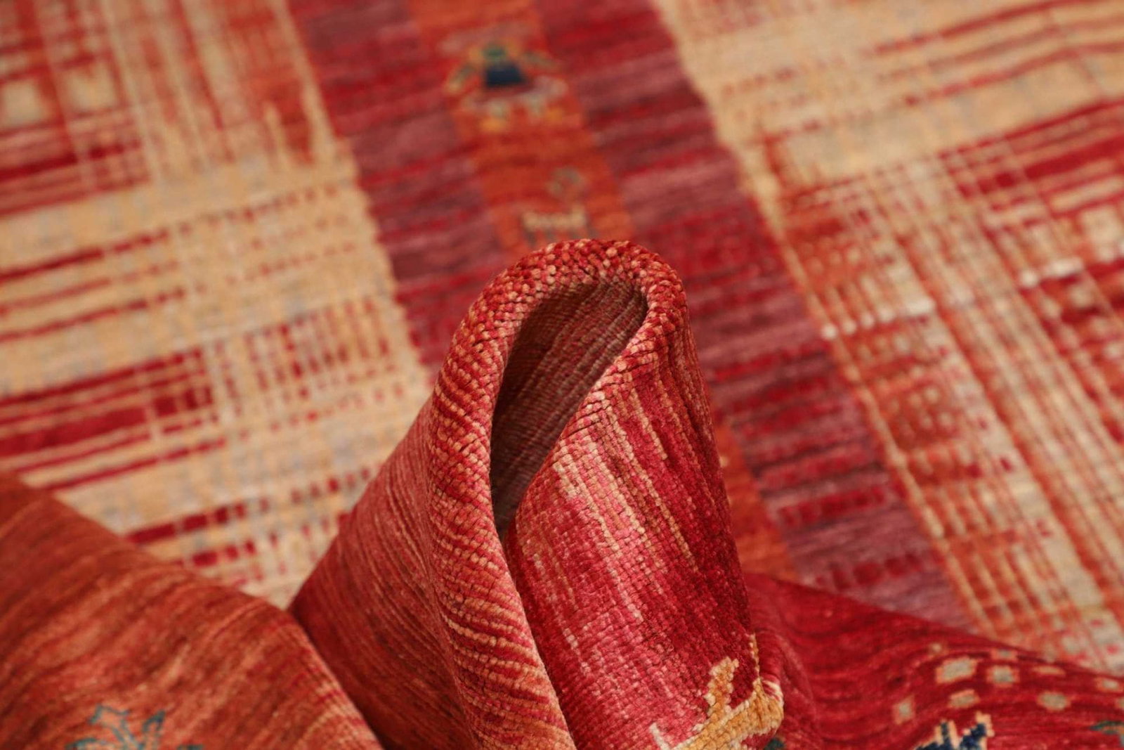 Die Besonderheit dieses Gabbeh Teppichs liegt in seiner einzigartigen Kombination aus Weichheit und Robustheit. Auch die Pflege ist unproblematisch, da die Wolle schmutzabweisend ist und die Reinigung mit einem feuchten Tuch einfach durchzuführen ist. Zudem verleihen die natürlichen Eigenschaften der Wolle dem Teppich eine hervorragende Schalldämmung, wodurch er auch in großen Räumen ein angenehmes Raumklima schafft.