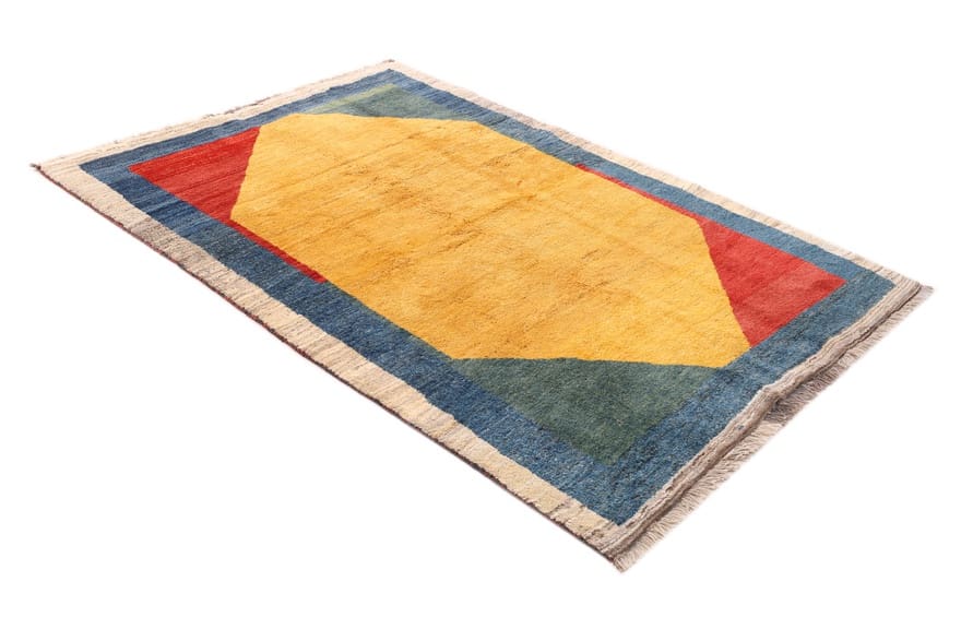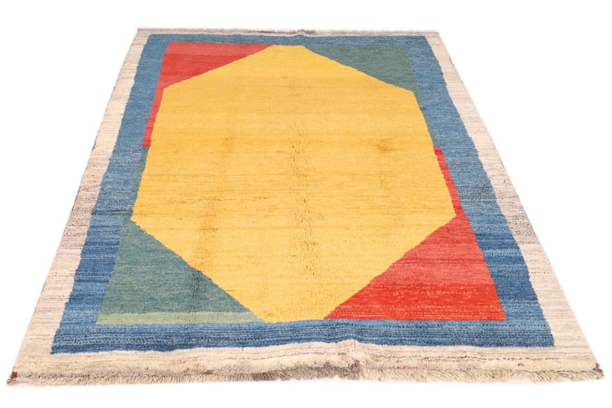 Gabbeh Teppiche zeichnen sich durch ihre lebendigen Farben und geometrischen Muster aus. Das Gelb dieses speziellen Teppichs symbolisiert Wärme, Sonne und Freude, während die Verwendung von naturbelassener Wolle eine Verbindung zur Natur und den traditionellen Weiden der nomadischen Völker aufzeigt.