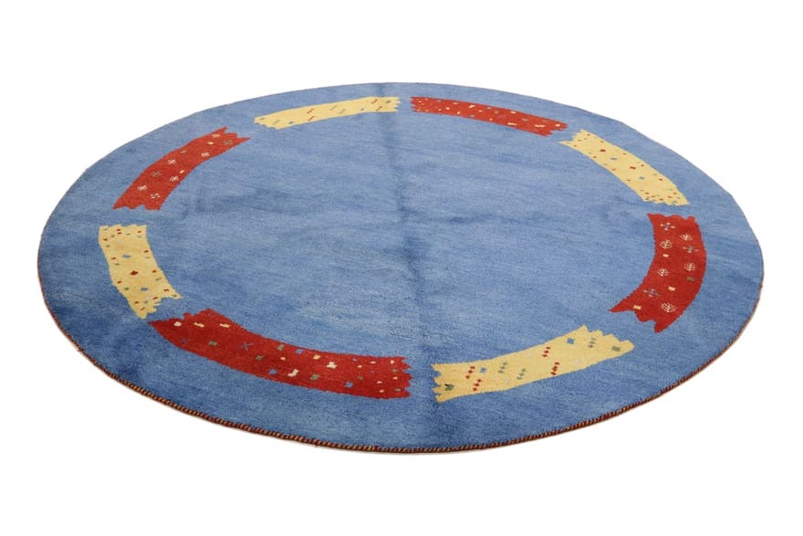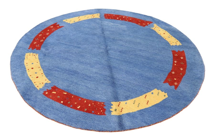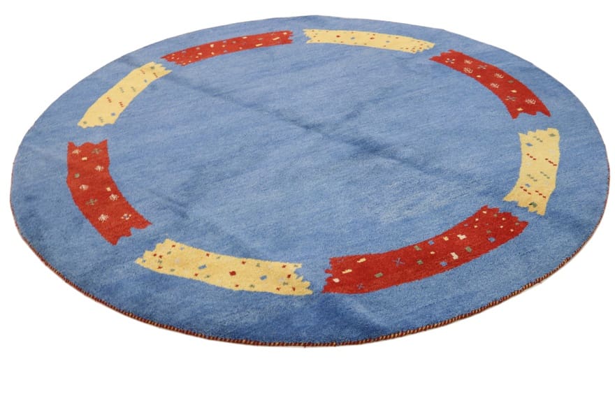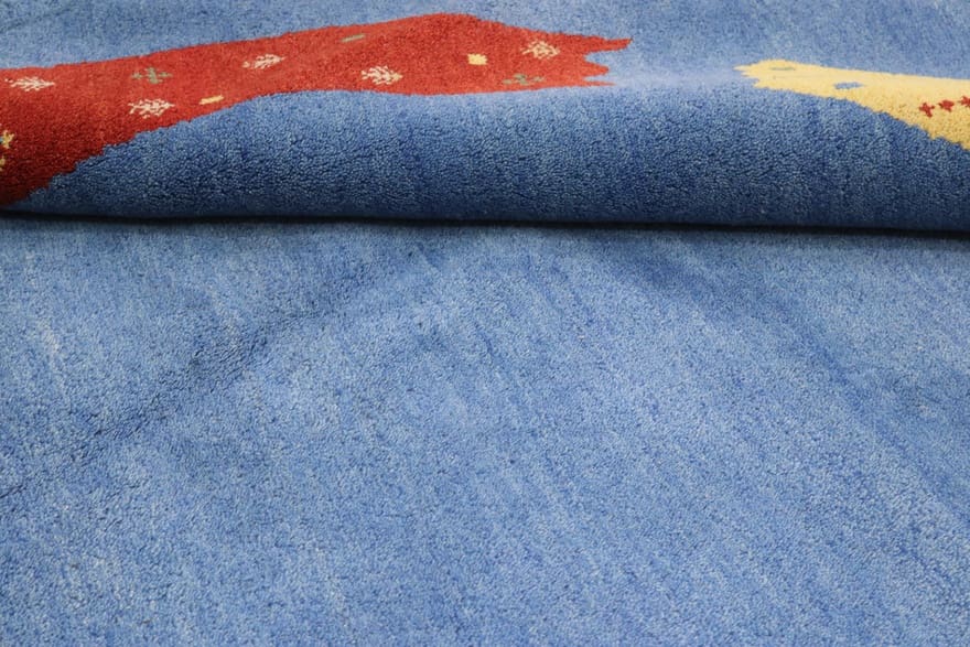 Gabbeh Teppich | Knotendichte: 90.000 Knoten/m² | Material: Wolle und Baumwolle | Größe: 252×251 cm | Farbe: Blau/Türkis | Ursprung: Indien | Verarbeitung: Handgeknüpft | Alter: Neuzeitlich (0-20 Jahre) | Dicke: ca. 12 mm | Gewicht: ca. 16 kg