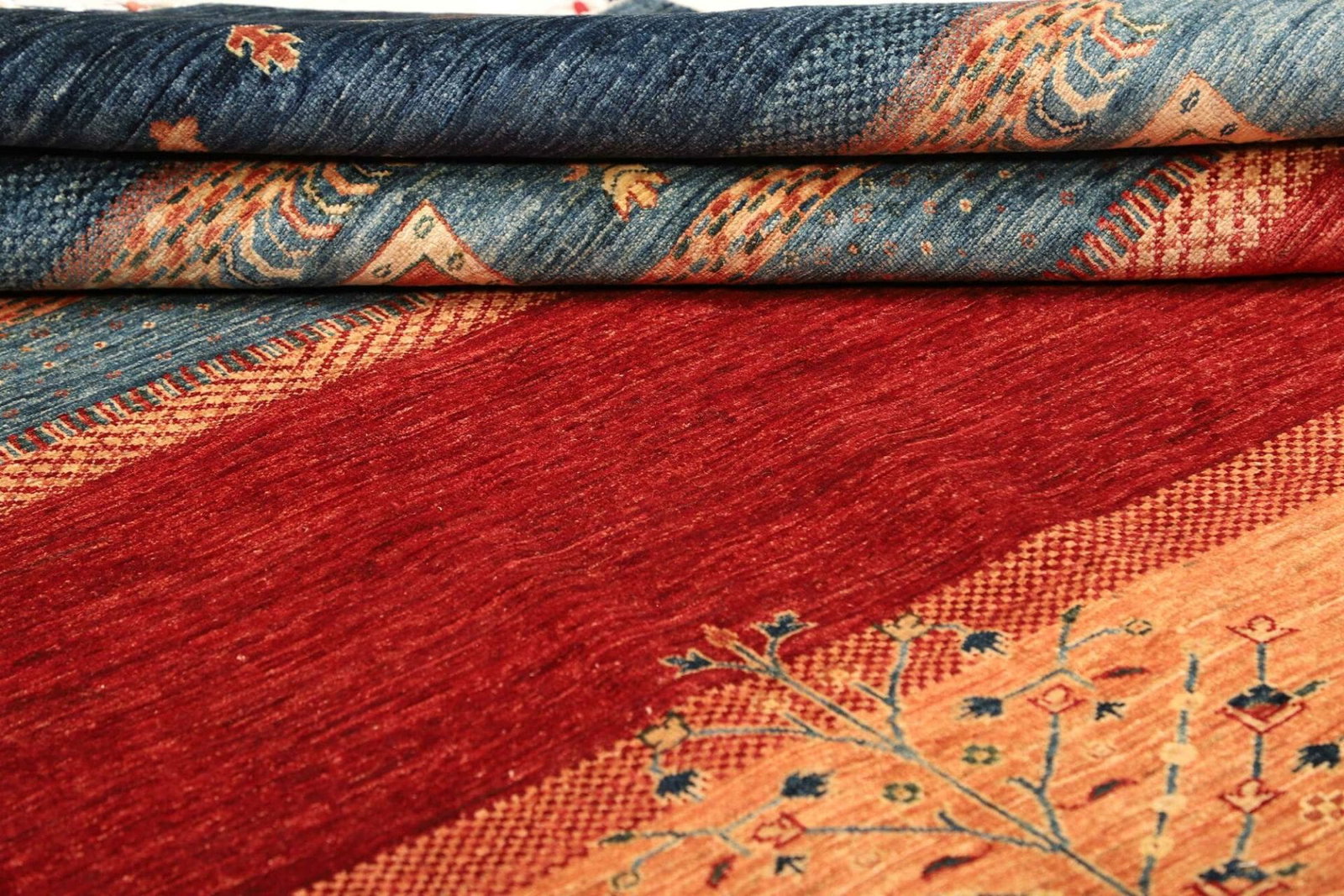 Die Designs variieren je nach Region und den Vorlieben der Knüpfer, wobei jedes Stück einzigartig ist. Diese Teppiche bieten durch ihre kreative Vielfalt eine hervorragende Möglichkeit, jeden Raum individuell zu gestalten und ihm eine persönliche Note zu verleihen.
