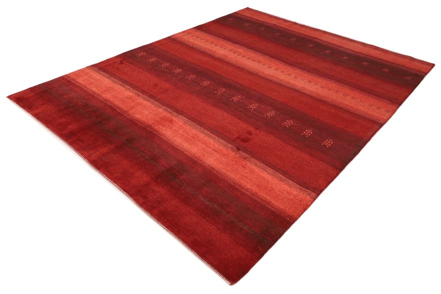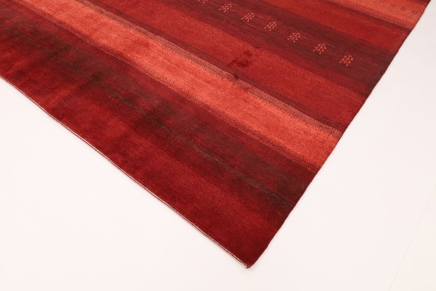 Gabbeh Teppich | Knotendichte: 128.000 – 160.000 Knoten/m² | Material: Wolle und Baumwolle | Größe: 337×255 cm | Farbe: Rot/Orange | Zustand: Neu | Herkunft: Iran/Persien | Verarbeitung: Handgeknüpft | Dicke: ca. 10 mm | Gewicht: ca. 35 kg