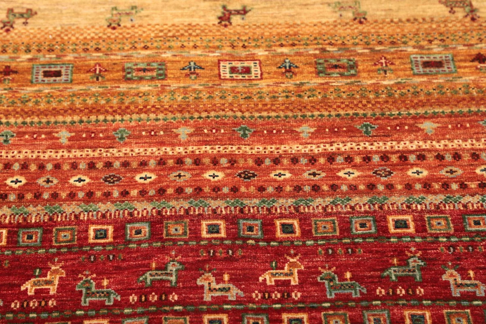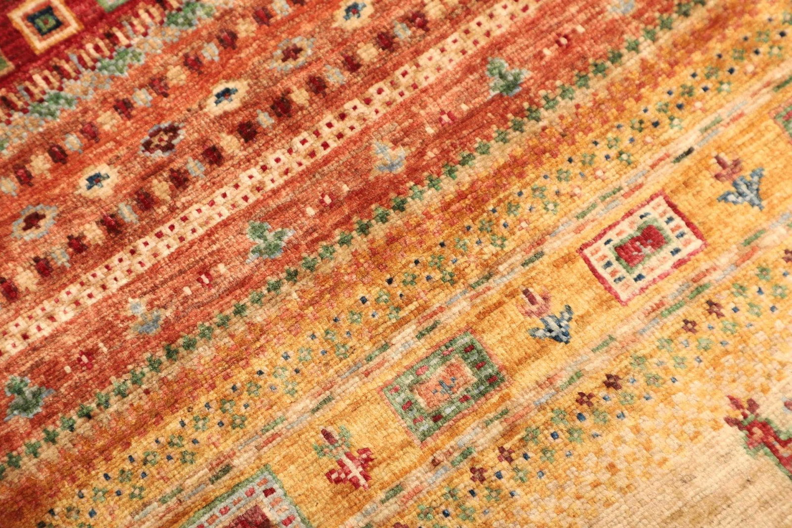 Ein weiteres charakteristisches Merkmal von Gabbeh Teppichen ist die unregelmäßige Textur, die durch die Verwendung von ungesponnener Wolle entsteht. Diese Unregelmäßigkeit trägt zur Authentizität des Teppichs bei und lässt ihn lebendig wirken, was in jedem Raum für ein besonderes Ambiente sorgt.