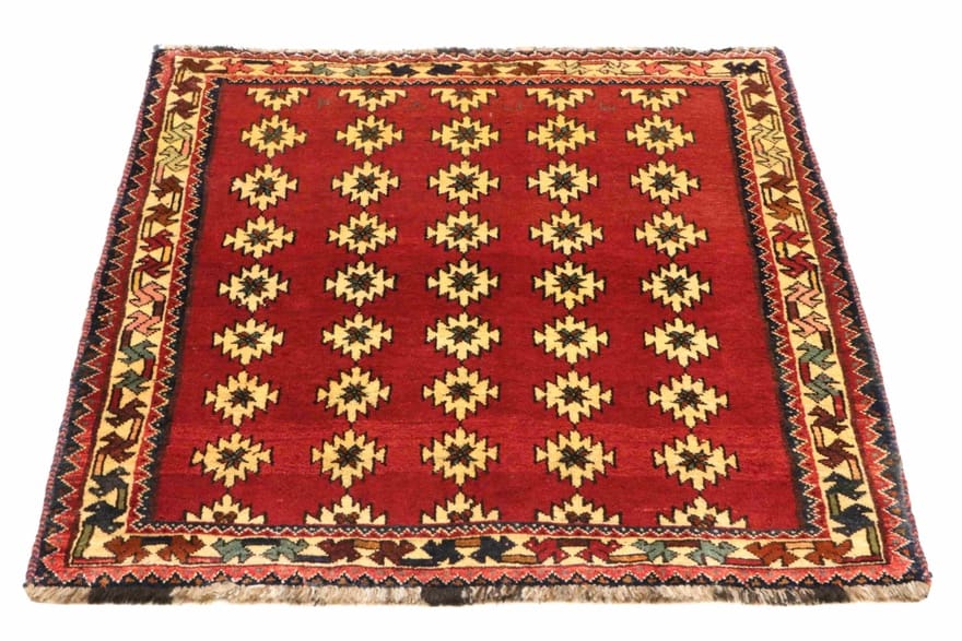 Ghashghai Teppich | Knotendichte: 128.000 – 160.000 Knoten/m² | Material: Handgesponnene Wolle | Größe: 147×118 cm | Farbe: Rot/Orange | Zustand: Neuzeitlich (0-20 Jahre) | Herkunft: Iran/Persien | Verarbeitung: Handgeknüpft | Dicke: ca. 10 mm | Gewicht: ca. 5 kg