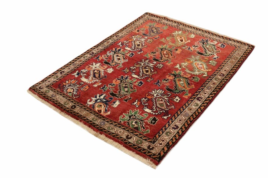 Handgeknüpfter Ghashghai Teppich | Knotendichte: 128.000 – 160.000 Knoten/m² | Material: 100 % Schurwolle | Größe: 153×115 cm | Farbe: Rot/Orange | Herkunft: Handgefertigt von Ghashghai-Nomaden | Zustand: Antik/Traditionell | Pflege: Regelmäßiges Staubsaugen, professionelle Reinigung empfohlen