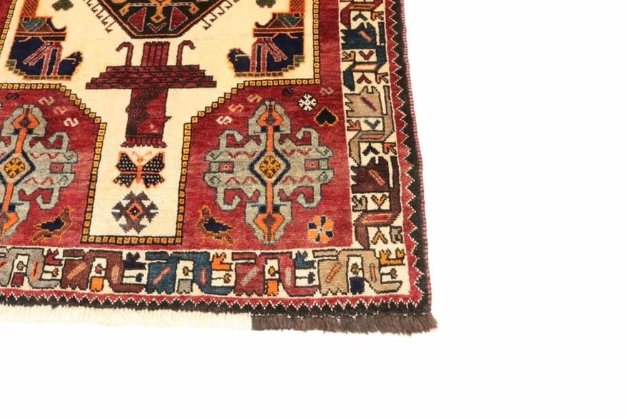 Handgeknüpfter Ghashghai-Teppich | Knotendichte: 160.000 – 200.000 Knoten/m² | Material: 100% Wolle | Größe: 172×113 cm | Farbe: Weiß/Beige | Ursprung: Iran/Persien | Zustand: Neu | Florhöhe: ca. 10 mm