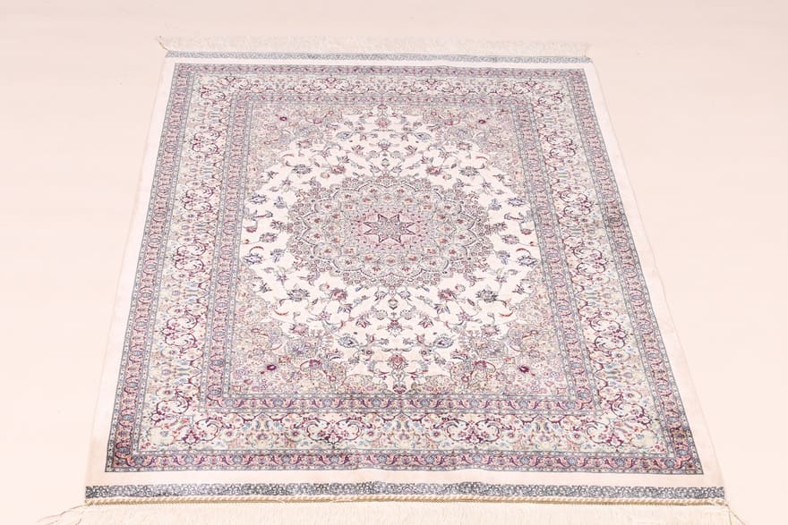 | Ghom Aloe Teppich | Knotendichte: Hoch | Material: Hochwertige Viskose | Größe: 152×101 cm | In neuem Zustand | Herkunft: Ghom, Iran | Verarbeitung: Maschinell gewebt | Dicke: ca. 6 mm | Farbe: Weiß/Beige | Form: Rechteckig | Teppich ID: 684910624206