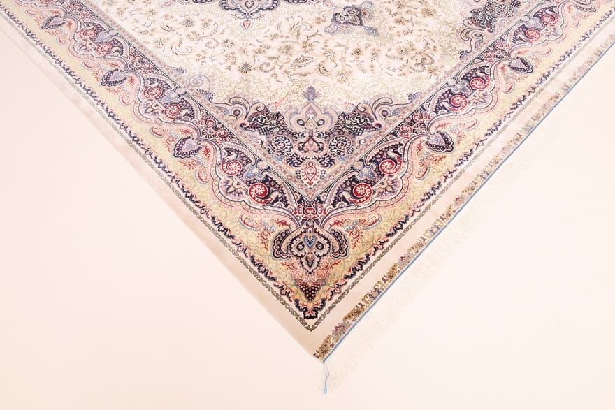 | Ghom Daisy Teppich | Knotendichte: Feinwebung | Material: Viskose und Kunstseide | Größe: 352×251 cm | Zustand: Neu | Herkunft: Ghom, Iran | Verarbeitung: Maschinell gewebt | Dicke: ca. 5 mm | Farbe: Weiß/Beige | Form: Rechteckig | Flor: Seidig glänzend | Strapazierfähig und pflegeleicht