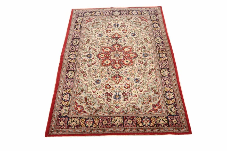 Ghom Kork Teppich | Knotendichte: 320.000 – 360.000 Knoten/m² | Material: Wolle und Baumwolle | Größe: 227×147 cm | In neuem Zustand | Herkunft: Iran/Persien | Farbe: Weiß/Beige | Verarbeitung: Handgeknüpft | Dicke: ca. 10 mm | Gewicht: ca. 10 kg