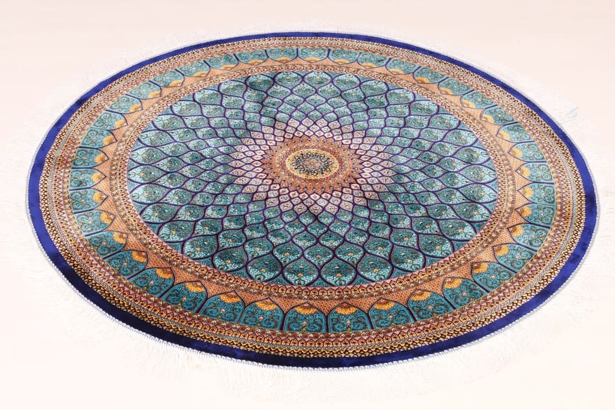 Runder Ghom-Geometrischer Teppich | Knotendichte: Hochwertige Feinheit | Material: Viskose und Kunstseide | Größe: 152×151 cm | Zustand: Neu | Herkunft: Ghom, Iran | Farbe: Blau/Türkis | Dicke: ca. 6 mm | Gewicht: ca. 6 kg