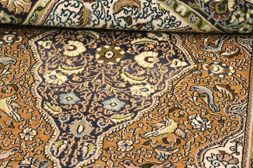 Die Stadt Ghom in Iran ist bekannt für ihre exquisite Teppichproduktion. Hier haben sich Handwerker zusammengefunden, die ihre Fähigkeiten von Generation zu Generation weitergegeben haben. Ghom ist nicht nur ein geografischer Ort, sondern auch ein Zentrum künstlerischer Schöpfungen, das für seine reichen und dynamischen Teppichdesigns bekannt ist. Die Teppiche aus dieser Region zeichnen sich durch eine Vielzahl von Motiven aus, die oft von der Persischen Mythologie und der Natur inspiriert sind. Sie bieten nicht nur ästhetische Schönheit, sondern auch eine gewisse spirituelle Bedeutung, da Tiermotive oft die Verbindung zwischen Mensch und Natur symbolisieren.