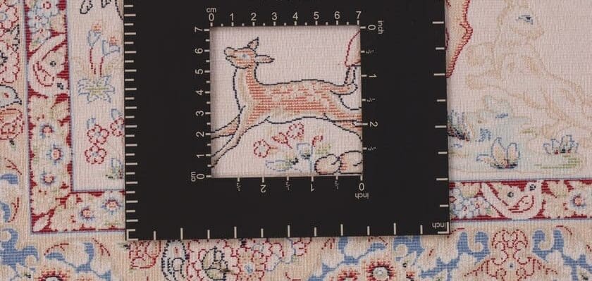 Hochwertiger Ghom Jagdrevier Teppich | Knotendichte: Sehr hoch (seidenähnliche Feinheit) | Material: 100% Viskose mit handveredelten Seidenfransen | Größe: 232×151 cm | Zustand: Neu | Herkunft: Ghom, Iran | Verarbeitung: Maschinell gewebt | Stil: Modern und traditionell | Farbe: Weiß/Beige | Dicke: ca. 5 mm
