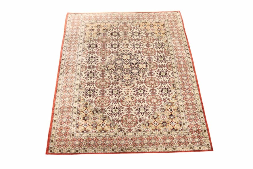 Dieser Teppich stammt aus Ghom, einer Stadt im Iran, die für ihre jahrhundertealte Teppichwebtradition bekannt ist. Ghom gilt als eine der wichtigsten Zentren der persischen Teppichherstellung. Die Teppiche aus diesem Gebiet sind berühmt für ihre exquisiten Designs und die Verwendung von hochwertigen Materialien. Die Stadt selbst hat eine lange Geschichte in der Kunst des Teppichknüpfens, und die Handwerker hier sind für ihre Finesse und Kreativität hoch angesehen.