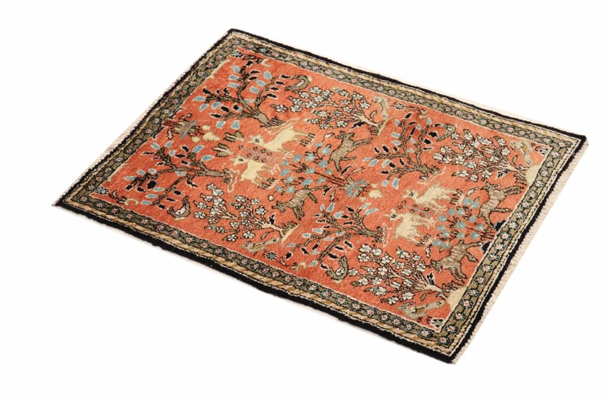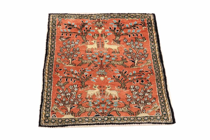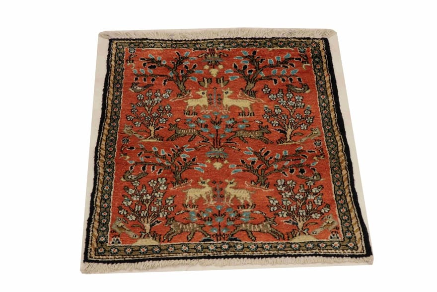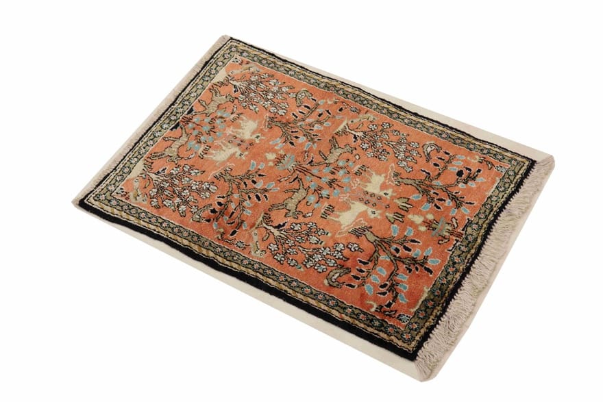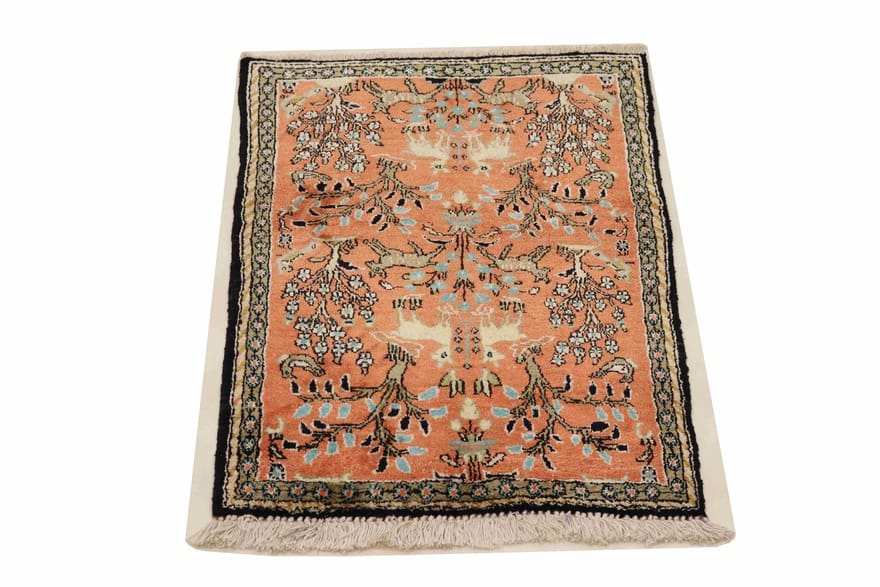 Traditioneller Ghom-Seidenteppich | Knotendichte: 440.000 – 490.000 Knoten/m² | Material: 100% Seide | Größe: 77×57 cm | Antik | Handgeknüpft | Herkunft: Iran/Persien | Farbe: Rot/Orange | Dicke: ca. 4 mm | Gewicht: ca. 2 kg