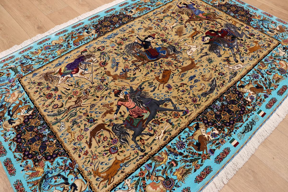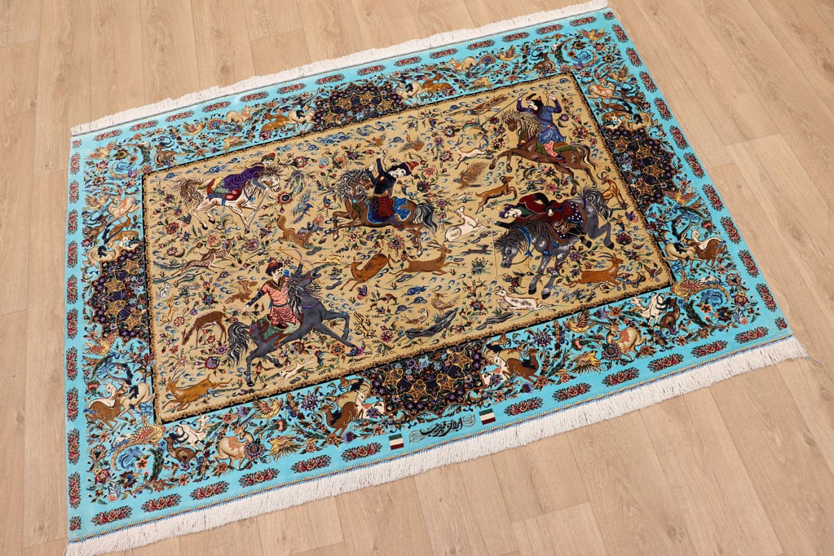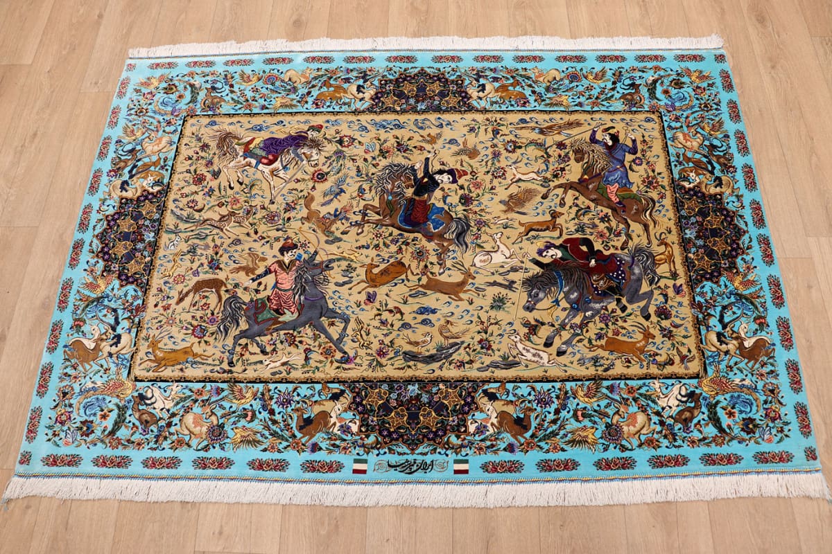 Ghom Seidenteppich Jagdszene 199×132 cm, handgeknüpft, Orientteppich