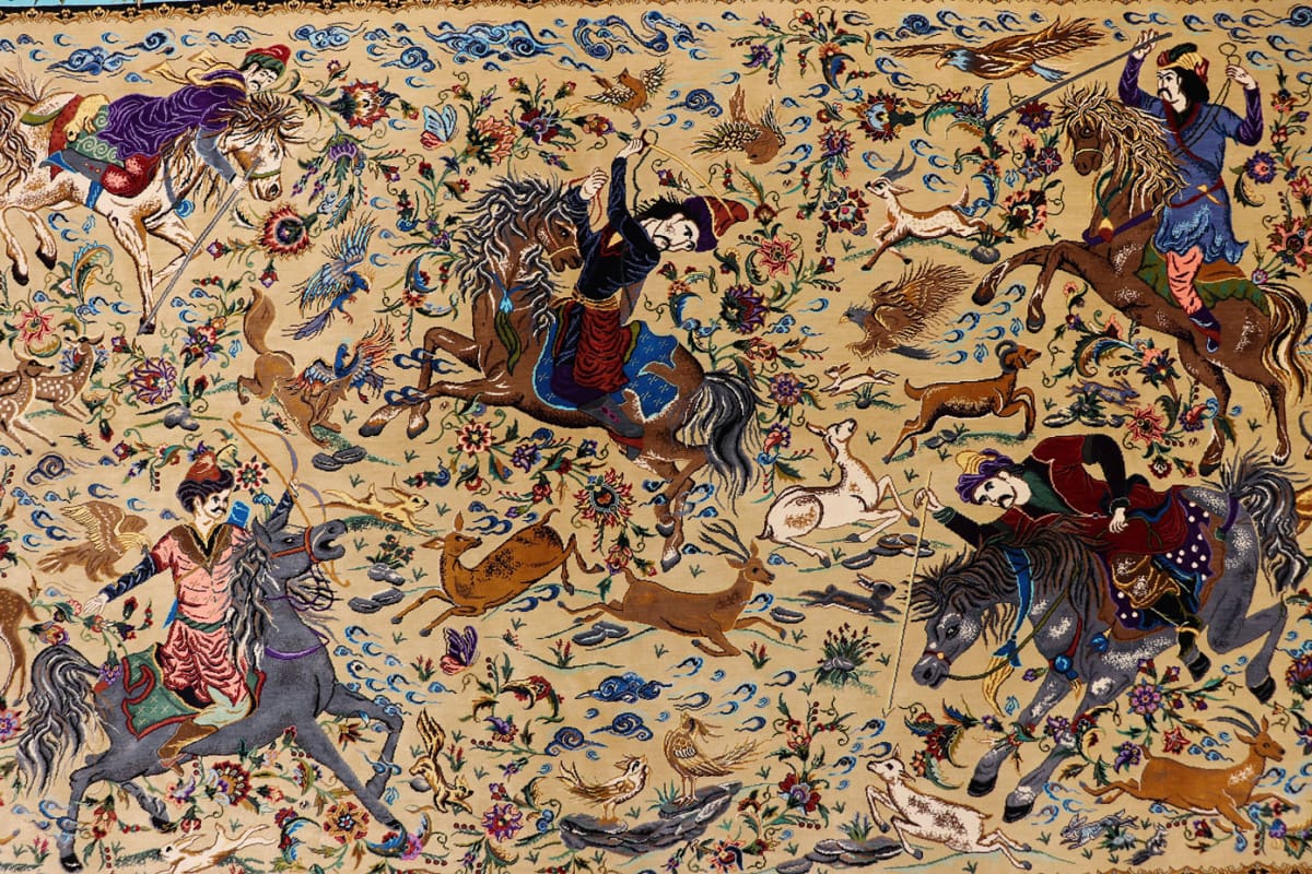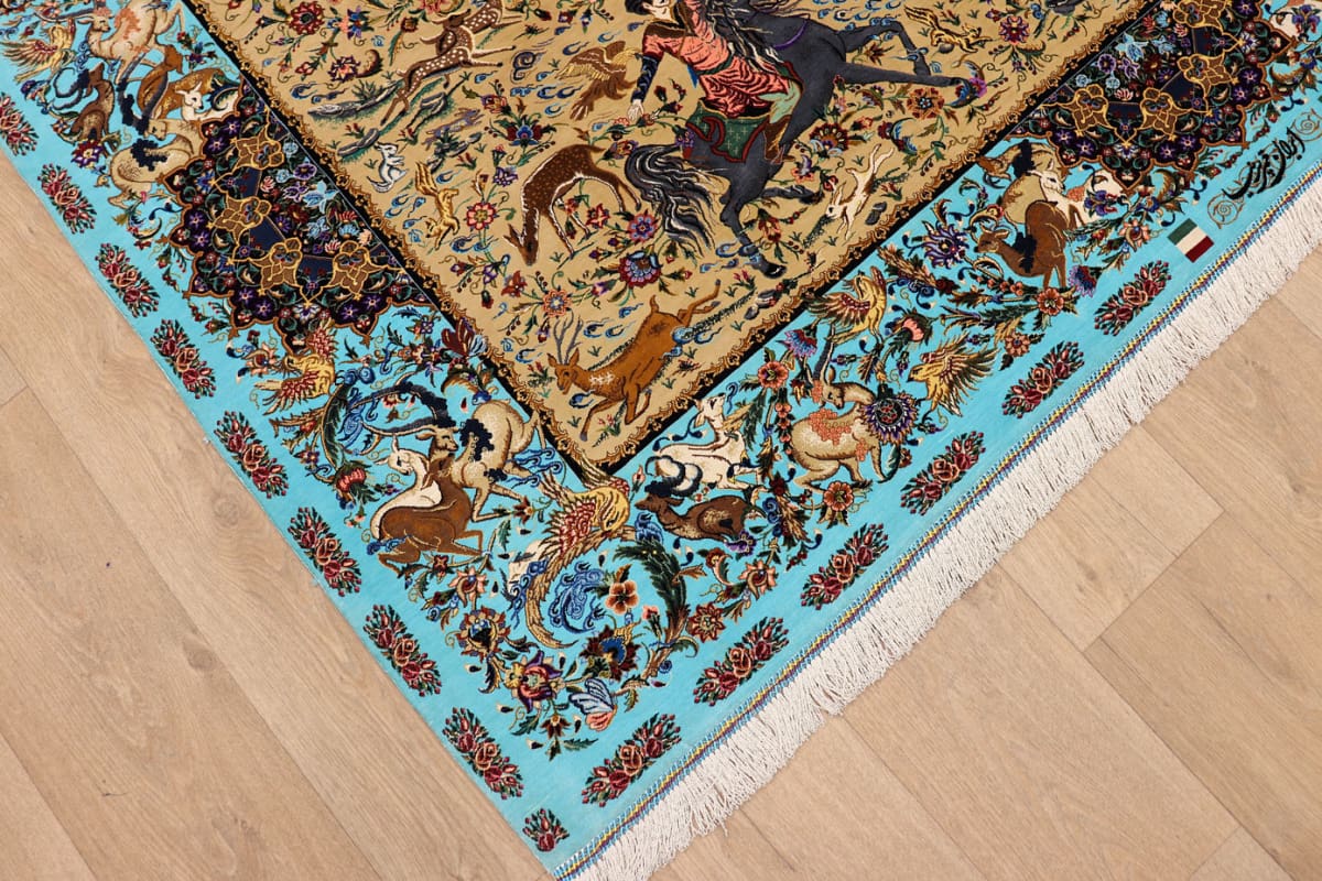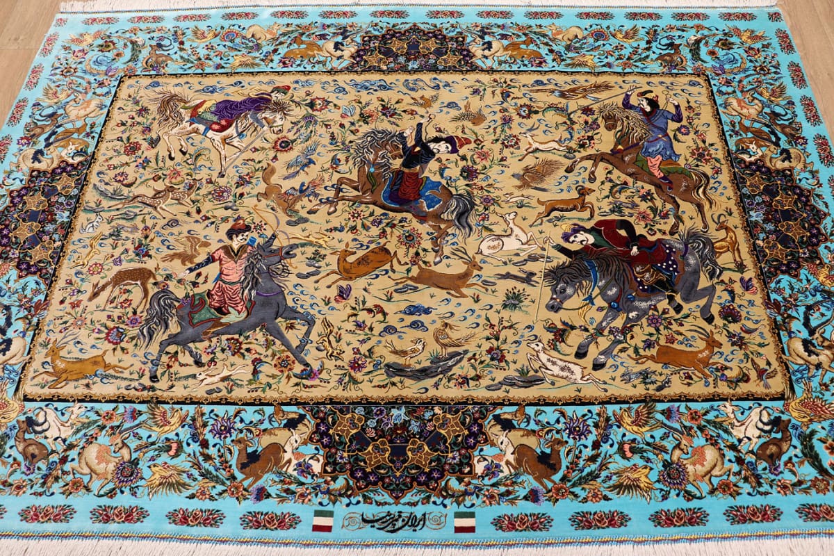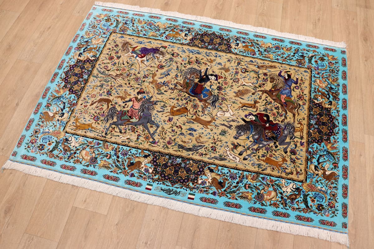 Ghom Seidenteppich Jagdszene 199×132 cm, handgeknüpft, Orientteppich