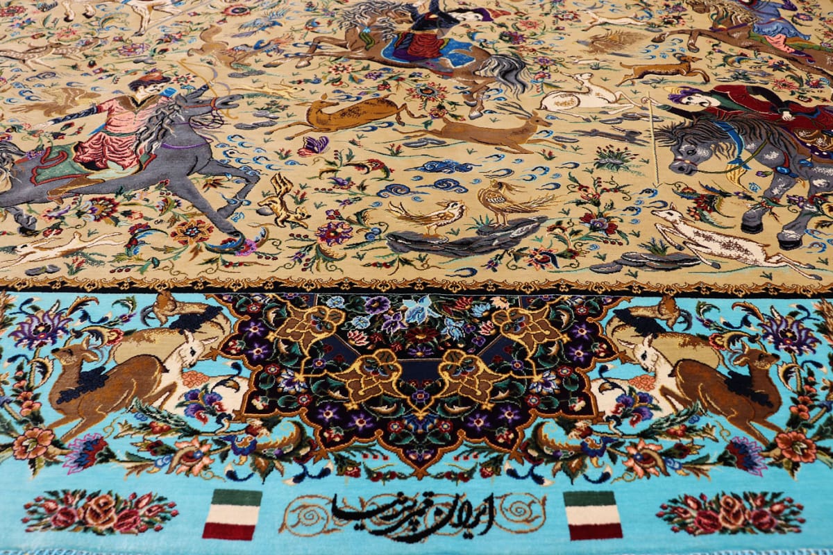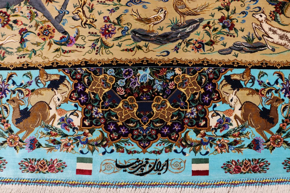 Ghom Seidenteppich Jagdszene, handgeknüpft, Orientteppich