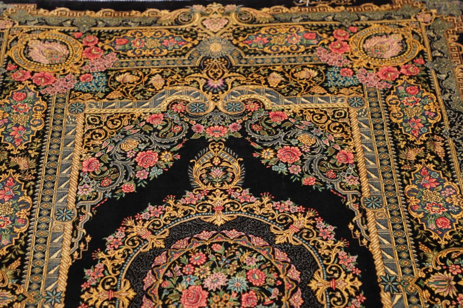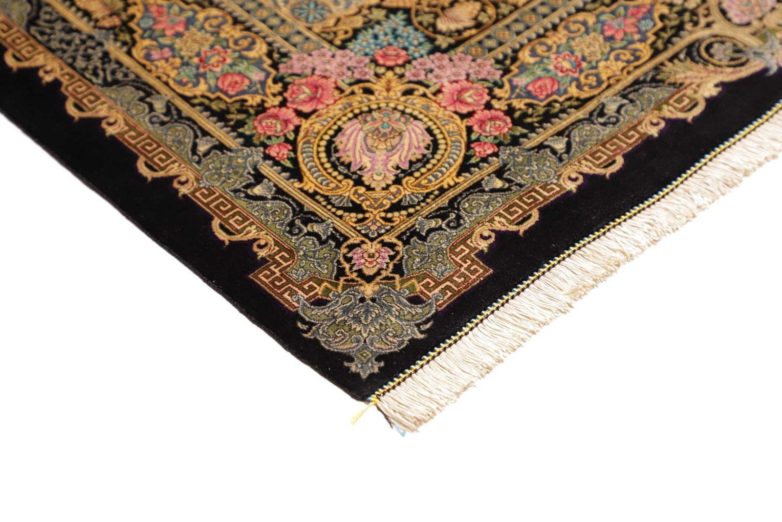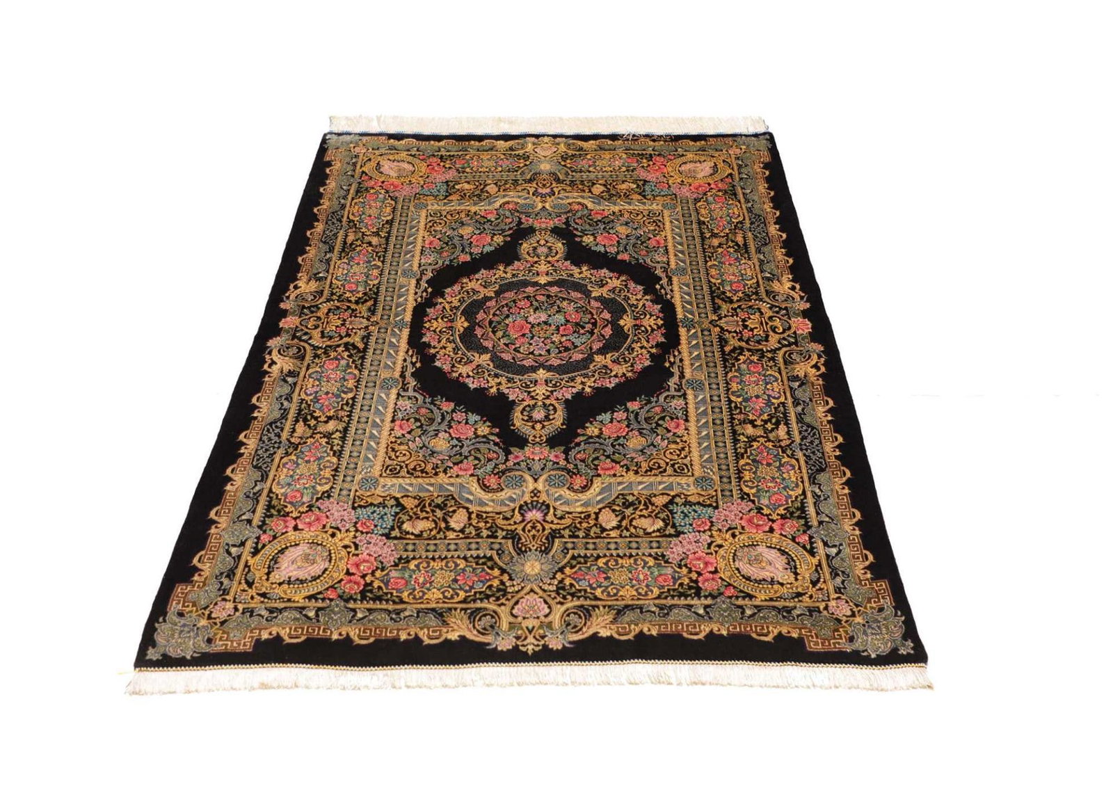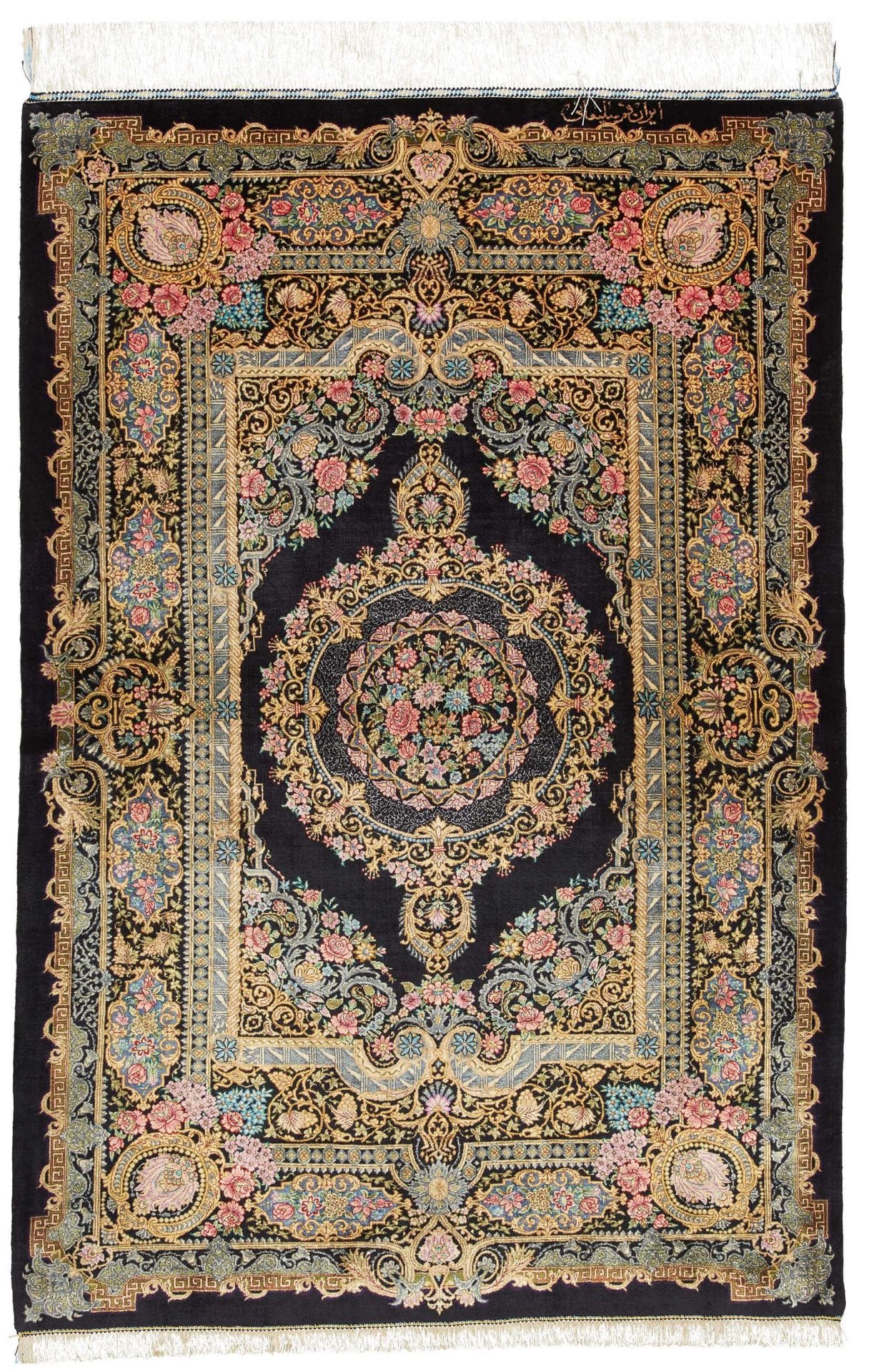 | Ghom Teppich | Knotendichte: ca. 900.000 Knoten/m² | Flor: 100% Seide | Kette: 100% Seide | Größe: 103 x 150 cm | Handgeknüpft | Herkunft: Iran | In ausgezeichnetem Zustand | Verleiht Ihrer Einrichtung eine exklusive Note