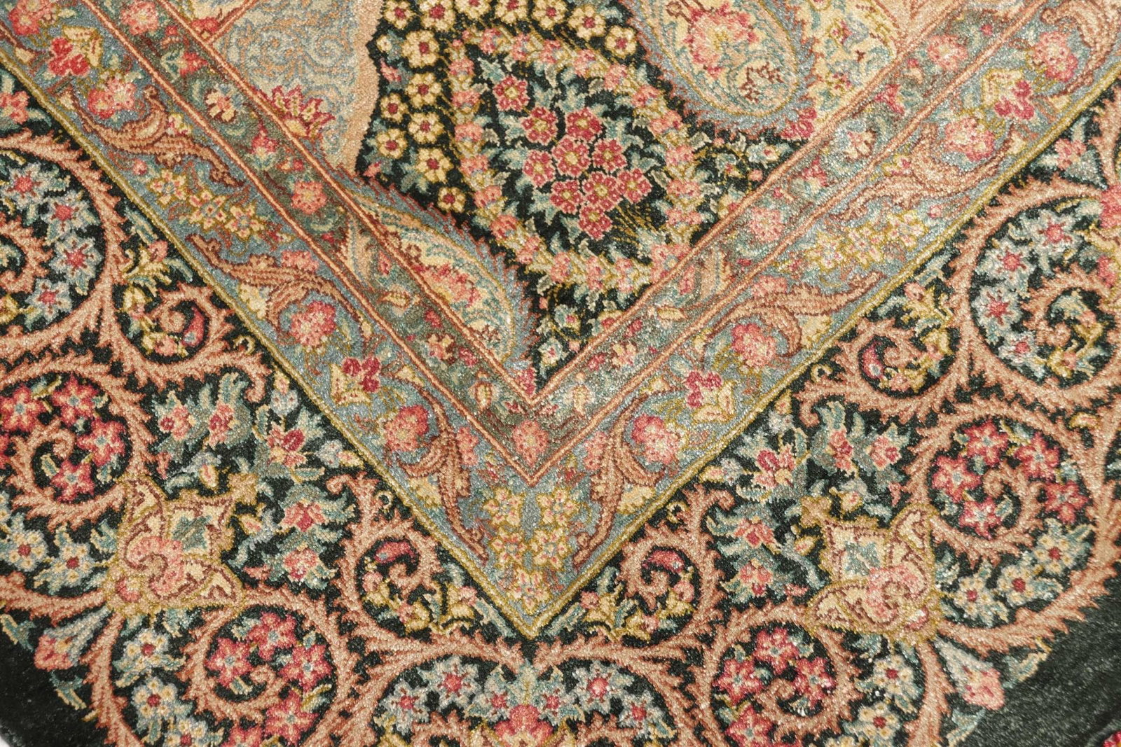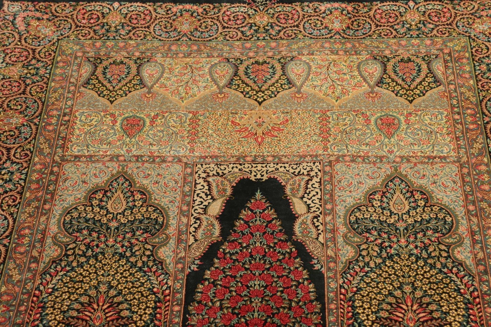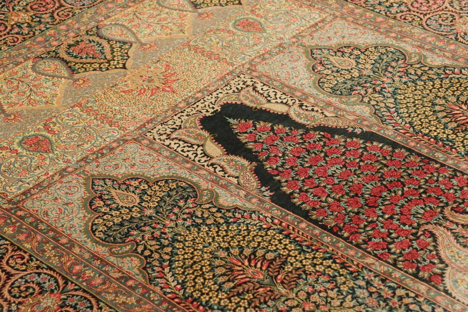 Die Verwendung von Seide in der Herstellung dieses Perserteppichs ist ein Zeichen höchster Qualität. Seide ist nicht nur bekannt für ihre außergewöhnliche Weichheit, sondern auch für ihre hohe Strapazierfähigkeit und farbintensive Strahlkraft. Ein Teppich aus Seide vermag selbst bei spärlicher Beleuchtung zu glänzen und Farben lebendig zur Geltung zu bringen. Die handgeknüpfte Technik erlaubt es, komplizierte Muster und Motive mit einer Präzision zu schaffen, die maschinell gefertigte Teppiche nicht erreichen können.