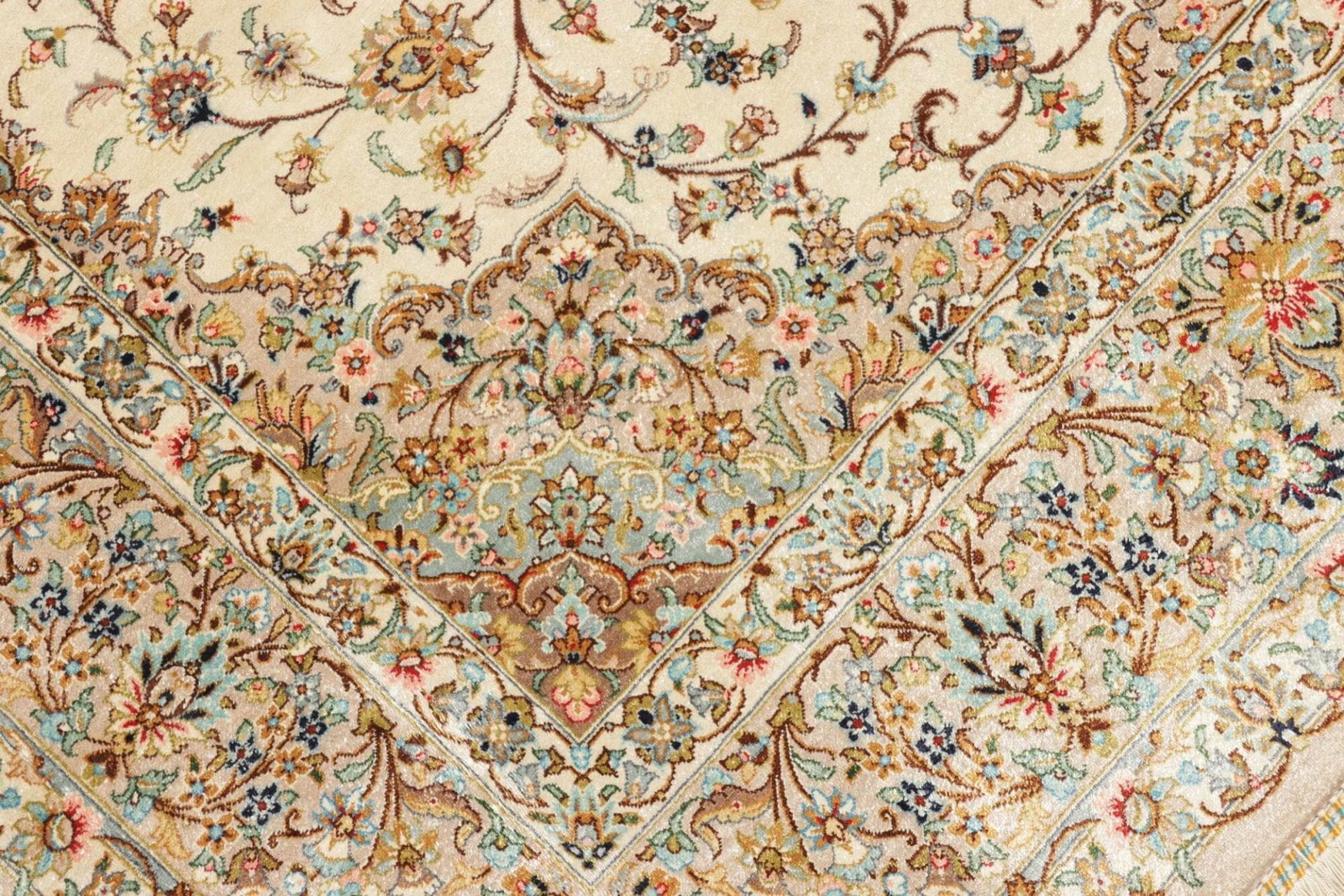Die Verwendung von Seide als Hauptmaterial verleiht diesem Teppich einen luxuriösen Glanz und eine unübertroffene Weichheit. Seide ist bekannt für ihre Haltbarkeit und Farbbrillanz und bietet gleichzeitig ein angenehmes Gefühl unter den Füßen. Um die Qualität und Langlebigkeit sicherzustellen, wurde der Teppich von erfahrenen Kunsthandwerkern in einer aufwendigen handgeknüpften Technik gefertigt. Dies sorgt nicht nur für Stabilität und Strapazierfähigkeit, sondern macht jeden Teppich zu einem individuellen Unikat.