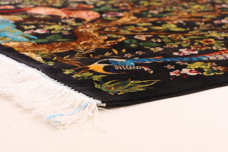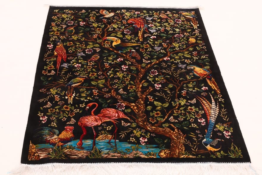 | Ghom Teppich mit schwarzem Hintergrund | Muster: Bäume und Vögel | Knotendichte: Hochwertige Verarbeitung | Größe: 152×101 cm | Material: Kunstseide | Zustand: Neu | Ursprung: Iran/Persien | Dicke: ca. 6 mm | Gewicht: ca. 6 kg | Form: Rechteckig