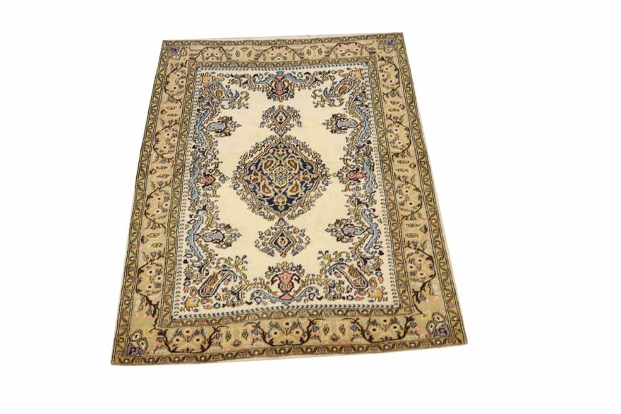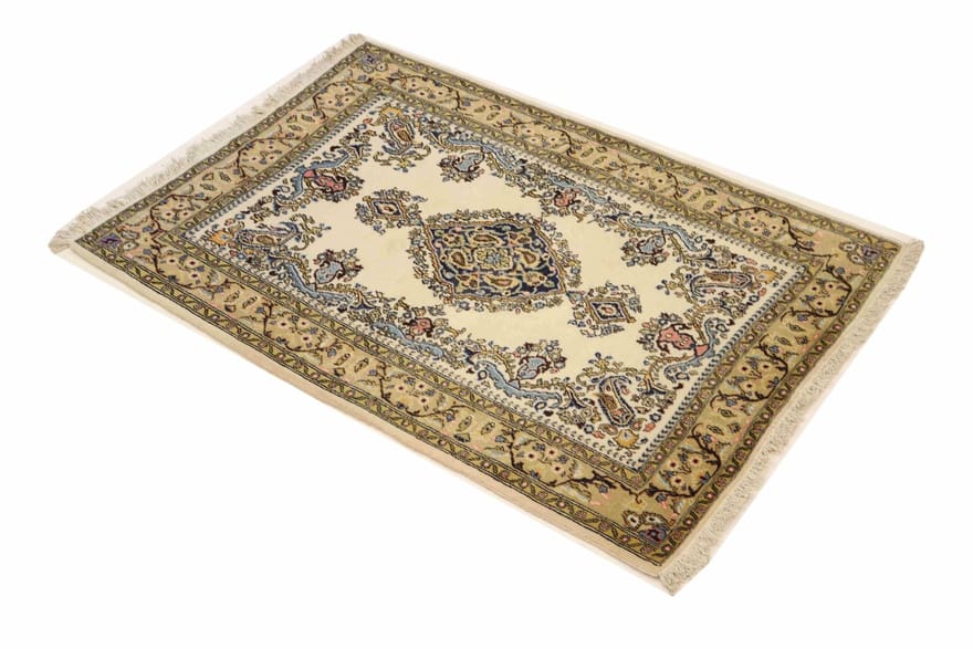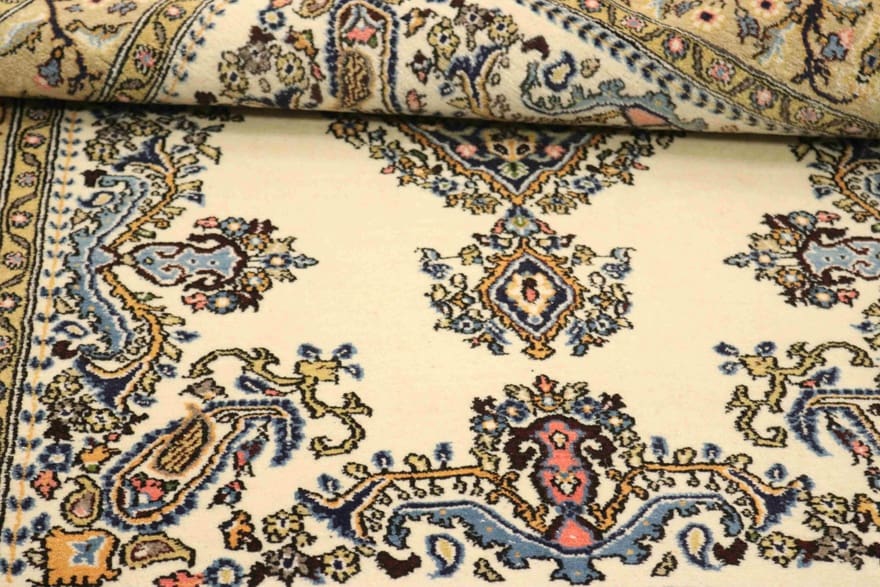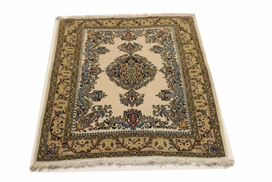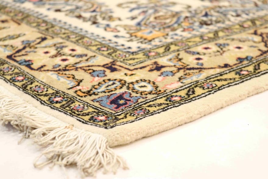 Handgeknüpfter Ghom-Teppich | Knotendichte: 320.000 – 360.000 Knoten/m² | Material: Hochwertige Wolle | Größe: 157×108 cm | Farbe: Weiß/Beige | Zustand: Neu | Herkunft: Iran/Persien | Florhöhe: ca. 8 mm | Gewicht: ca. 6 kg | Kette: Baumwolle