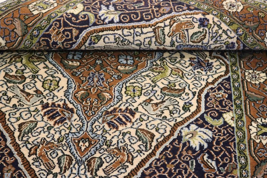Die Teppichknüpferei in Ghom ist besonders für ihre komplexen Designs und eleganten Muster berühmt. Traditionell werden in Ghom florale und geometrische Motive verwendet, die oft mit religiösen Symboliken verbunden sind. Diese Symbole tragen tiefere Bedeutungen, die zu der spirituellen und kulturellen Bedeutung des Teppichs beitragen. So steht beispielsweise die Lilie oft für Reinheit und das Leben, während geometrische Muster oft für den Weg des Lebens stehen.