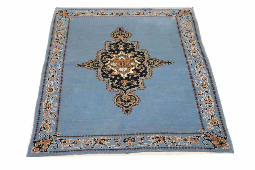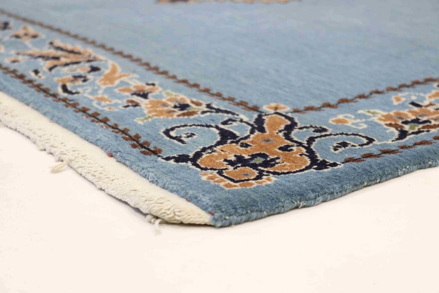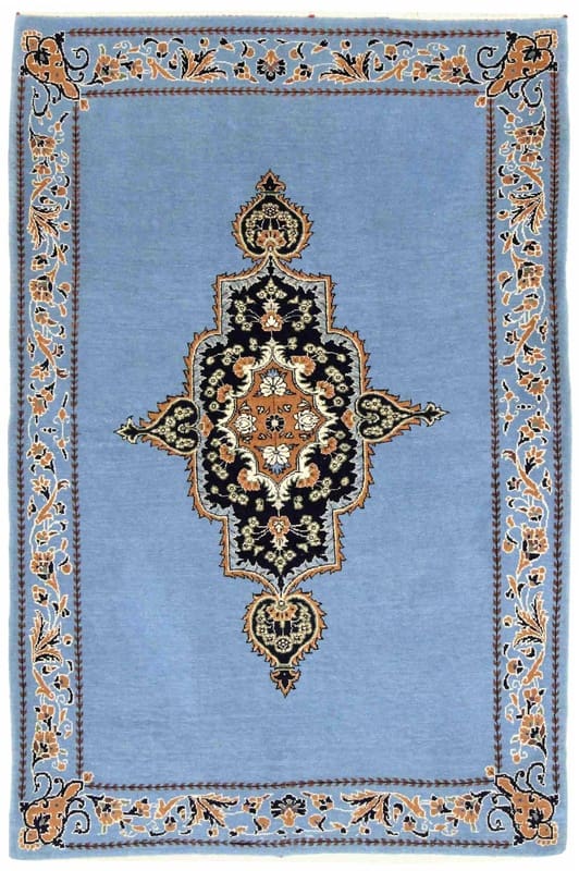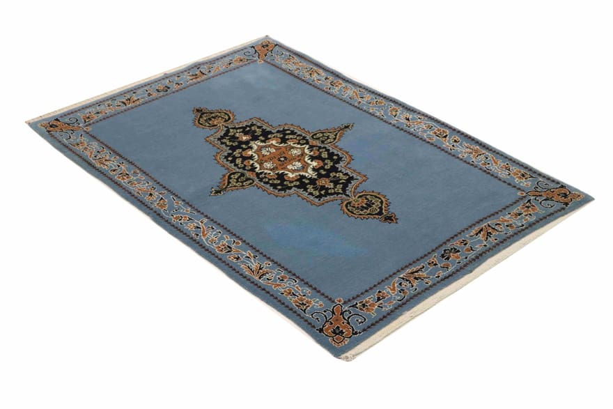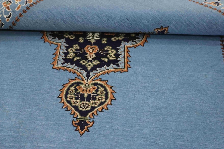 Ghom Teppich | Knotendichte: 320.000 – 360.000 Knoten/m² | Größe: 164×111 cm | In neuem Zustand | Herkunft: Iran / Persien | Farbe: Blau/Türkis | Handgeknüpft | Flor: Handgesponnene Wolle | Gewicht: ca. 6 kg | Dicke: ca. 10 mm | Form: Rechteckig