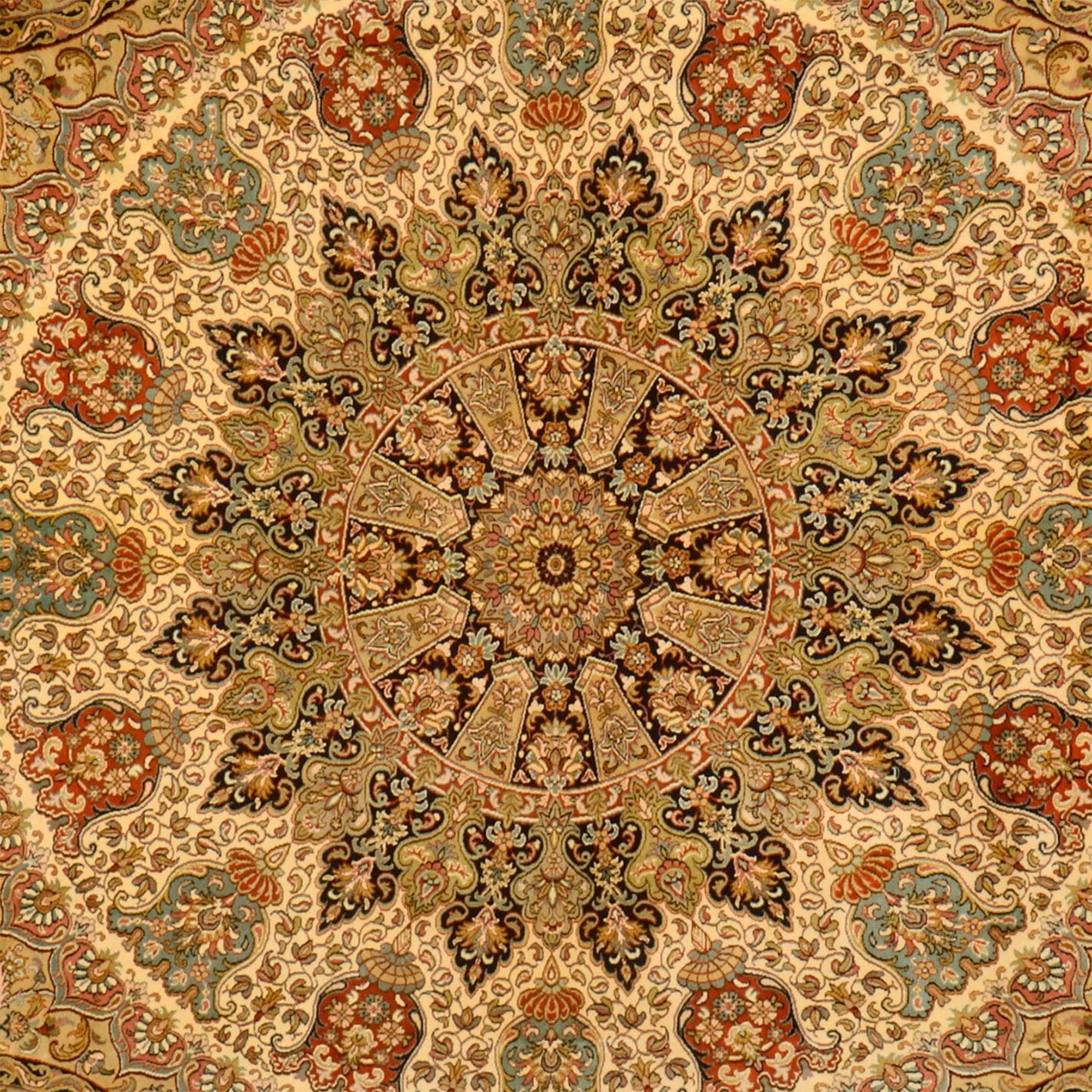 Der Ghom Teppich besteht aus hochwertiger Seide, die bekannt ist für ihre außergewöhnliche Weichheit und ihren brillanten Glanz. Die Verwendung von Seide als Hauptmaterial verleiht dem Teppich nicht nur einen luxuriösen Charakter, sondern sorgt auch für eine gute Langlebigkeit und Strapazierfähigkeit. Die handgeknüpften Teppiche aus Ghom zeichnen sich zudem durch eine hohe Knotendichte aus, was bedeutet, dass die Muster besonders detailreich und fein ausgeführt werden können. Jedes einzelne Knotenelement ist ein Zeichen des künstlerischen Talents und der Geduld der Handwerker, die über viele Monate hinweg an einem einzigen Teppich arbeiten.