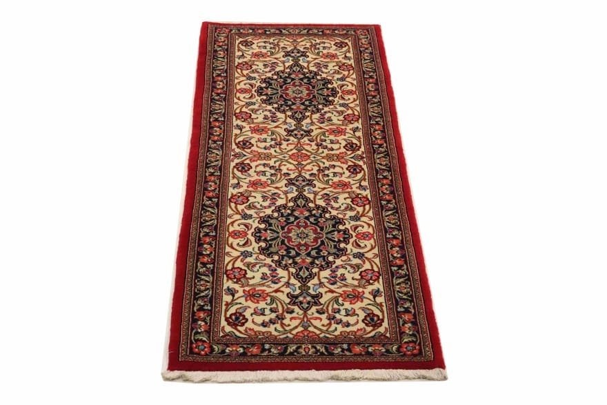 100 % handgeknüpft | Knotendichte: 450.000 – 500.000 Knoten/m² | Material: Edle Wolle auf Baumwollkette | Größe: 199×66 cm | Farbe: Beige, Rot, Dunkelblau | Zustand: Neu | Ursprung: Iran / Persien | Flor: Handgesponnene Wolle | Dicke: ca. 10 mm | Gewicht: ca. 5 kg | Form: Läufer