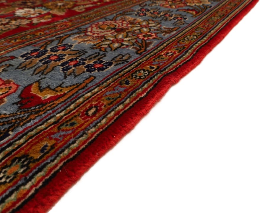 Handgeknüpfter Ghom Teppich | Knotendichte: 320.000 – 360.000 Knoten/m² | Material: Hochwertige Wolle mit Seidenanteil | Größe: 200×143 cm | Farbe: Rot mit hellblauem Rand | Zustand: Neuzeitlich (0-20 Jahre) | Ursprung: Iran/Persien | Pflegeleicht und strapazierfähig