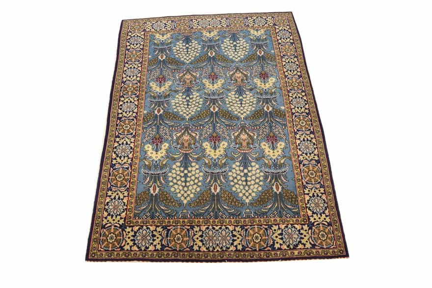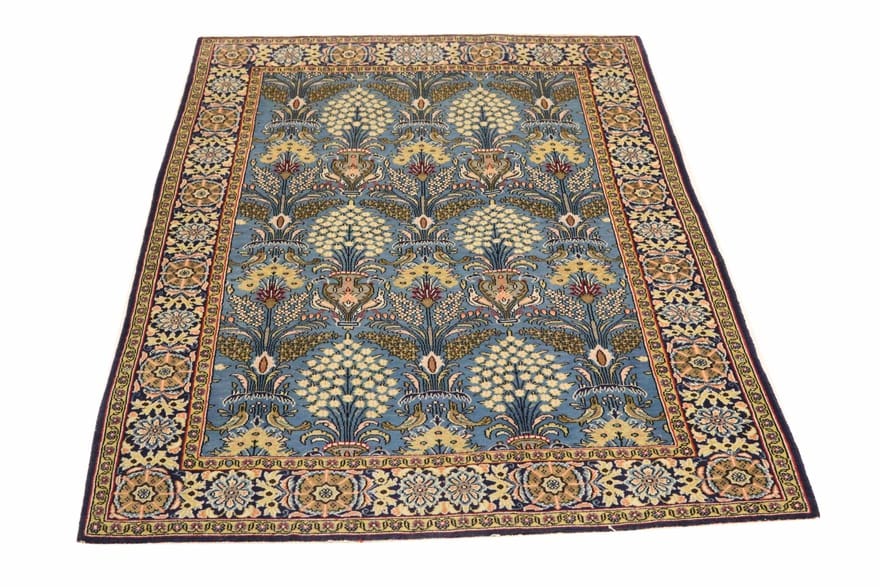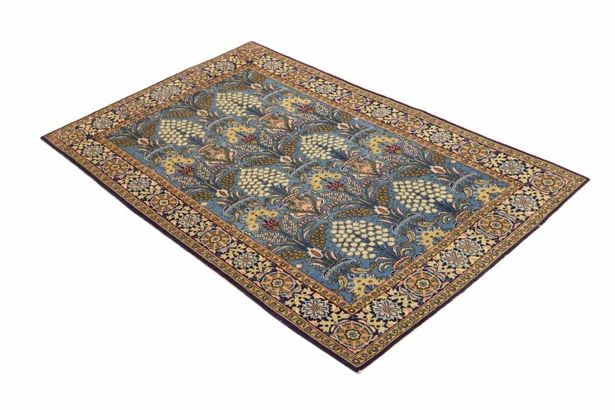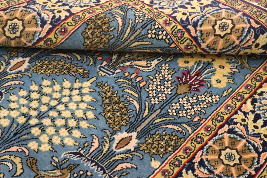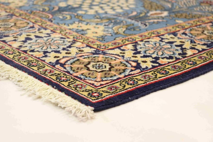 Ghom-Teppich | Knotendichte: 320.000 – 360.000 Knoten/m² | Material: Wolle/Seide | Größe: 209×137 cm | In neuem Zustand | Farbe: Blau/Türkis | Verarbeitung: Handgeknüpft | Ursprung: Iran/Persien | Dicke: ca. 10 mm | Gewicht: ca. 10 kg