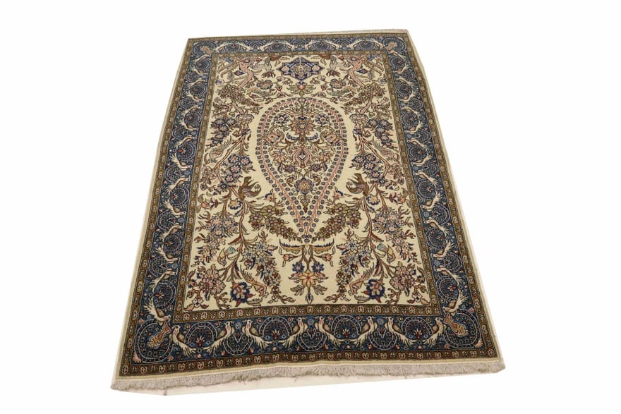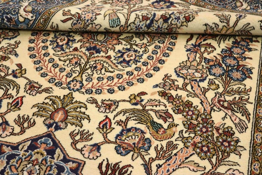Handgeknüpfter Ghom-Teppich | Knotendichte: 320.000 – 360.000 Knoten/m² | Material: Wolle und Seide | Größe: 217×139 cm | Farbe: Weiß/Beige | Zustand: Neu | Herkunft: Iran/Persien | Dicke: ca. 10 mm | Gewicht: ca. 10 kg