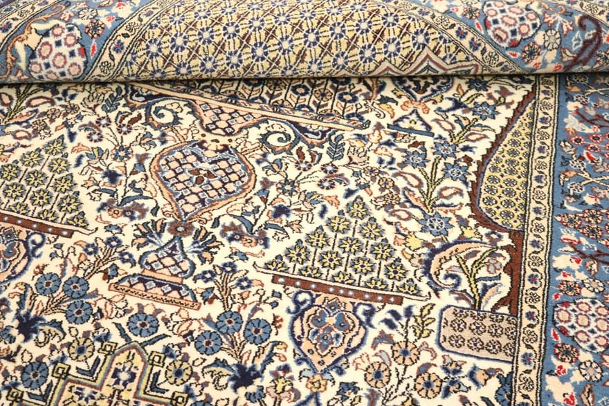 Die Verwendung von 100% Seide macht diesen Teppich besonders luxuriös und widerstandsfähig. Seide hat neben ihrem schimmernden Glanz auch eine hohe Strapazierfähigkeit, die durch die handgeknüpfte Technik der Herstellung noch verstärkt wird. Jeder Teppich wird von Hand gefertigt, was einen unverwechselbaren Charakter verleiht. Dank der feinen Knotentechnik und der sorgfältigen Auswahl der Materialien ist der Ghom Teppich nicht nur ein dekoratives Element, sondern auch eine Investition in zeitlose Qualität.