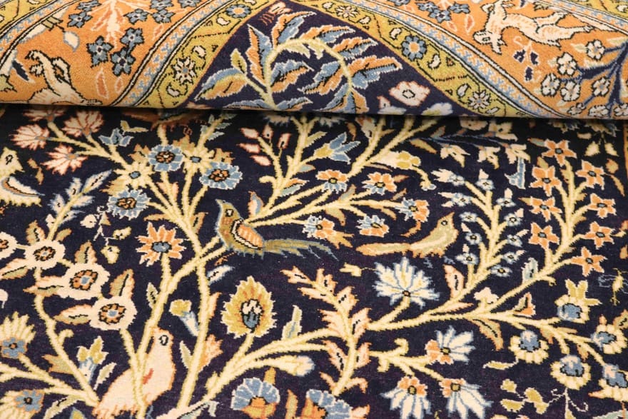 Die Designs und Muster, die auf dem Ghom Teppich zu finden sind, sind ein Ausdruck traditioneller Kunstfertigkeit und symbolischer Bedeutung. Häufig finden sich florale und geometrische Motive, die mit symbolischen Farben kombiniert sind. Diese Muster erzählen Geschichten und spiegeln die kulturellen Einflüsse der Region wider. Die Verwendung von Seide verleiht den Farben eine besondere Leuchtkraft, die dazu anregt, dass sich das Licht wunderbar bricht und so dem Teppich eine lebendige Ausstrahlung verleiht.