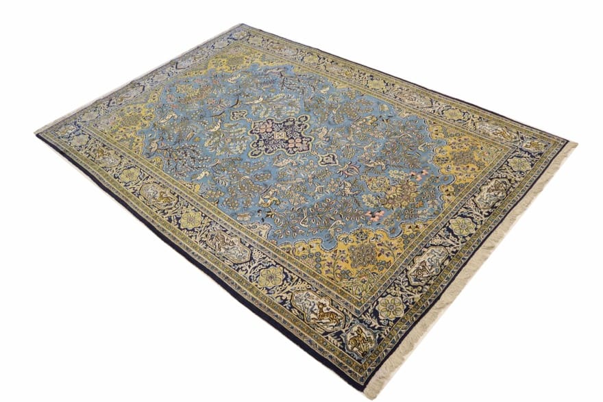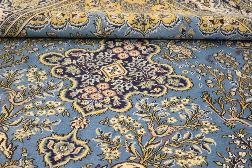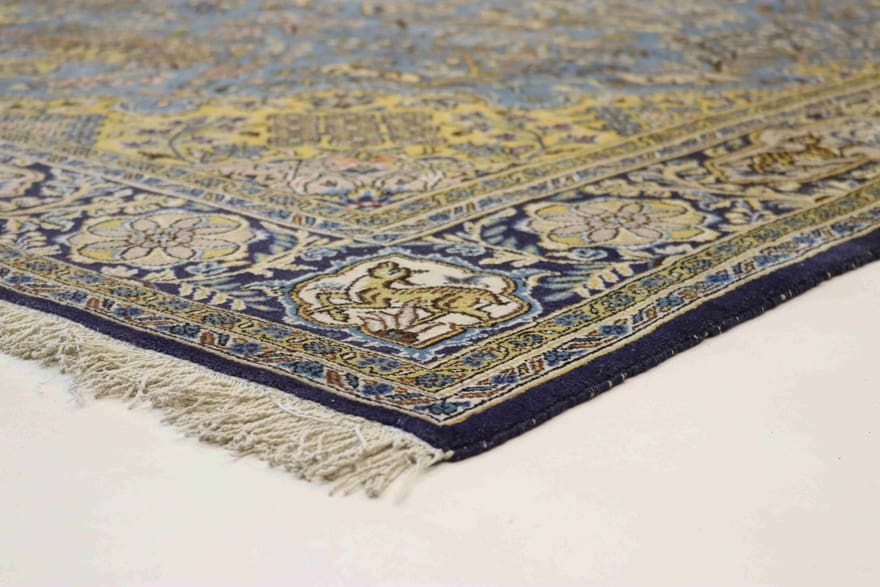 Ghom-Teppich | Knotendichte: 320.000 – 360.000 Knoten/m² | Material: Handgesponnene Wolle und Baumwollkette | Größe: 330×226 cm | Farbe: Blau/Türkis | Dicke: ca. 8 mm | Gewicht: ca. 26 kg | Zustand: Neu | Herkunft: Iran/Persien | Verarbeitung: Handgeknüpft