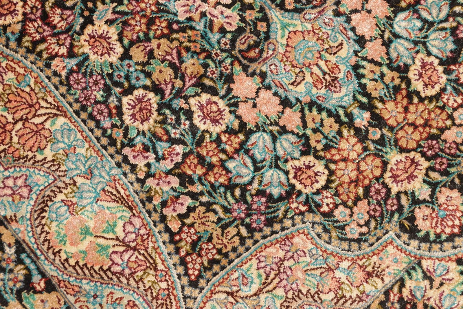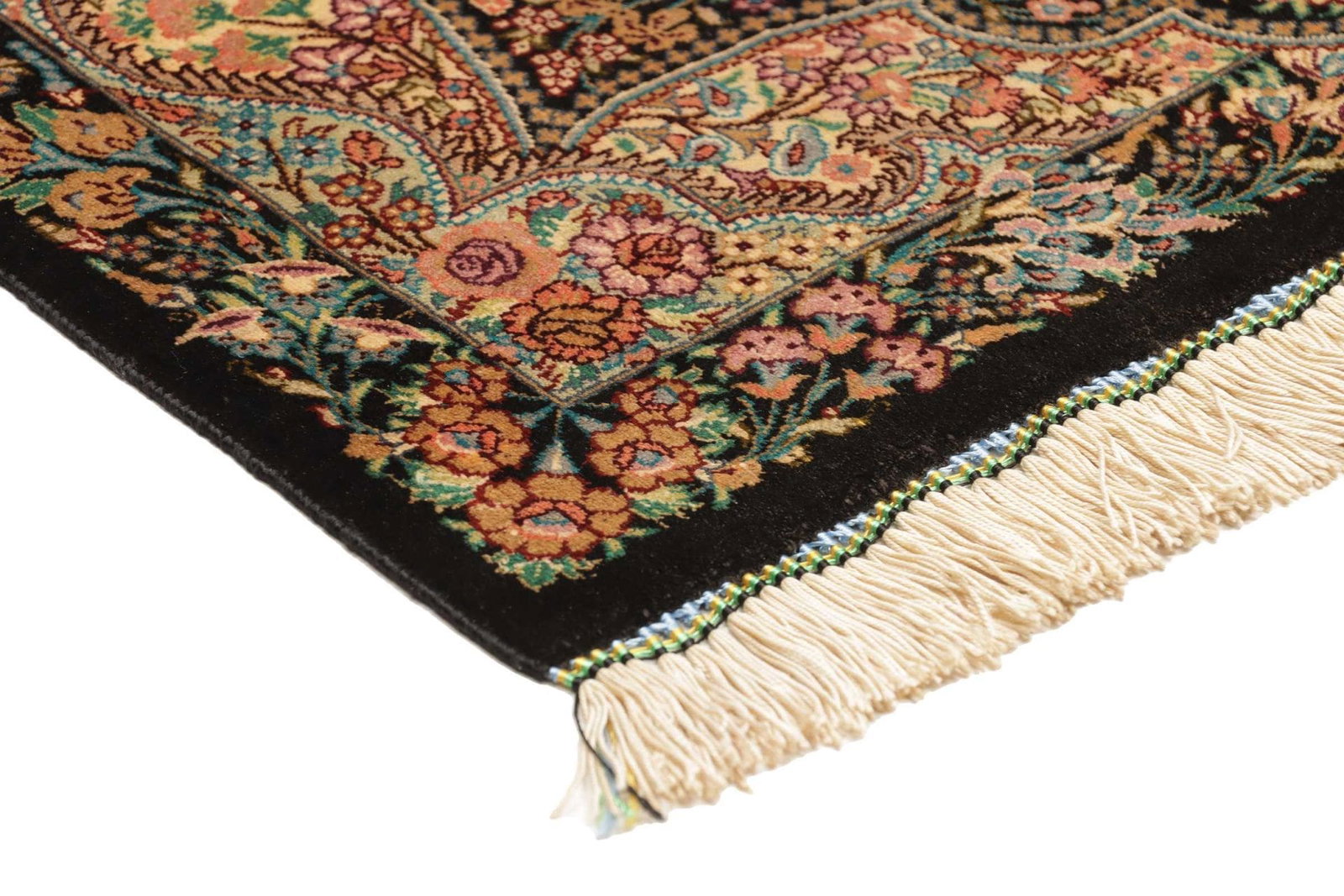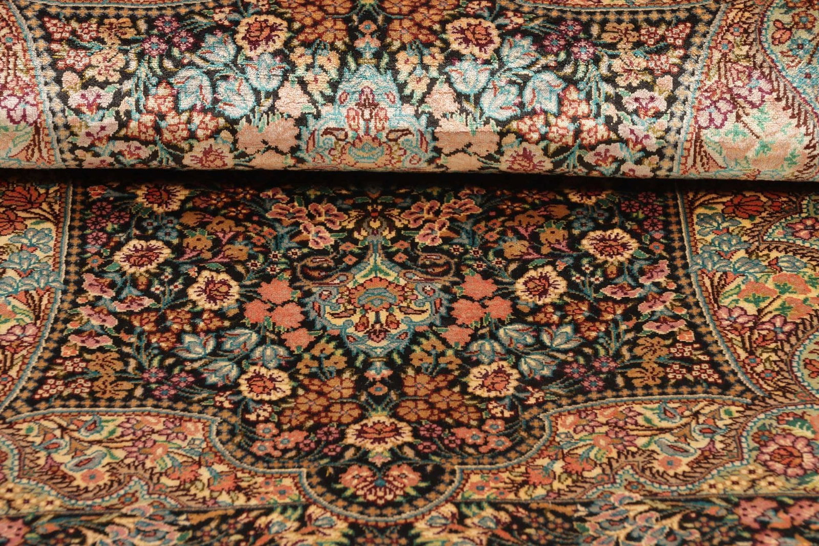 Ghom Teppich – handgeknüpft, Seide, florale Muster