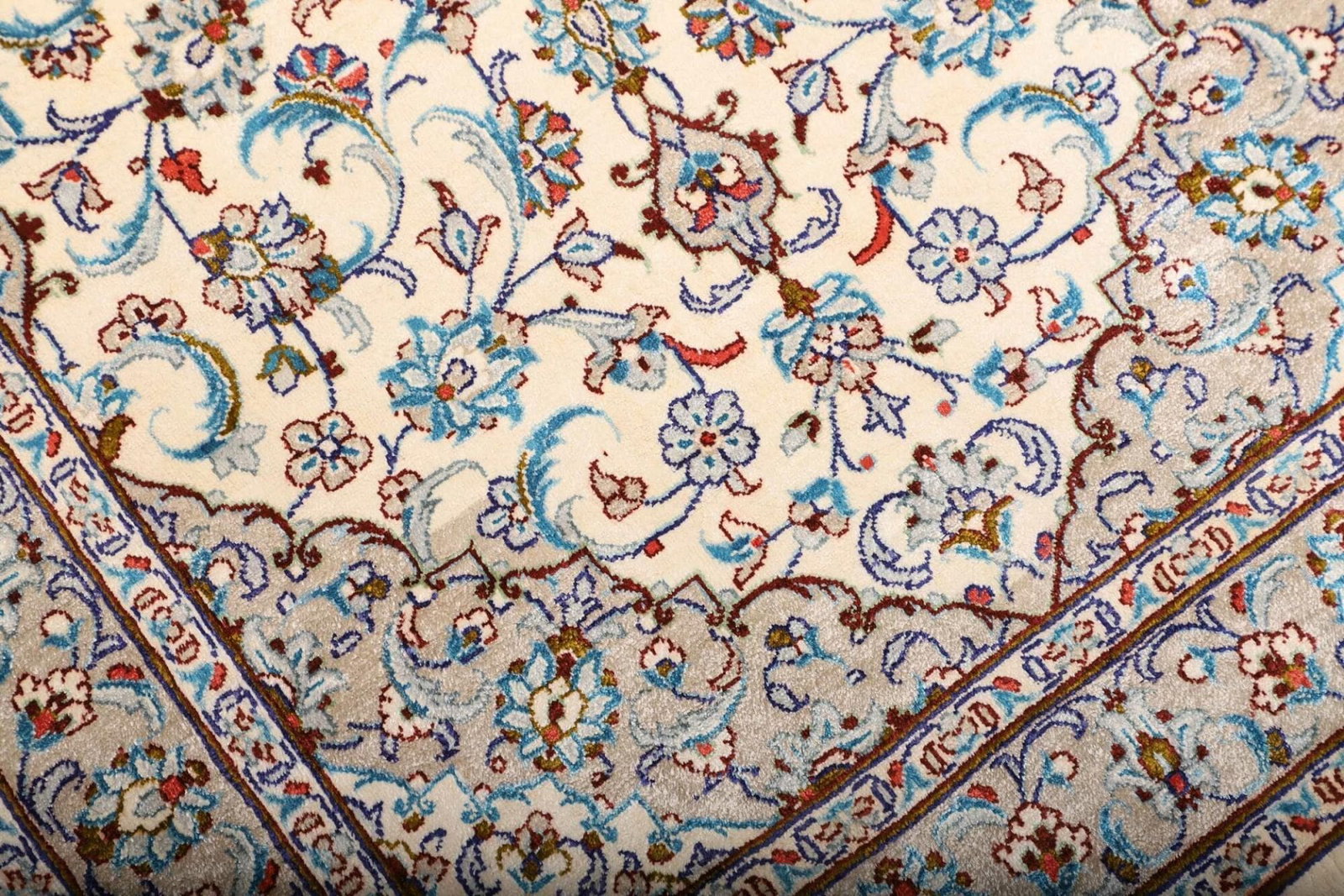 Der Ghom Teppich besteht aus hochwertiger Seide, die ihm eine einzigartige Weichheit und einen strahlenden Glanz verleiht. Seide ist bekannt für ihre Langlebigkeit und Widerstandsfähigkeit, was den Teppich zu einer hervorragenden Wahl für jeden Wohnraum macht. Die handgeknüpfte Technik sorgt für eine dichte Knotung, die nicht nur die Haltbarkeit erhöht, sondern auch eine außerordentliche Detailgenauigkeit der Muster und Designs ermöglicht. Die hohe Knotendichte gewährleistet, dass die Farben lebendig bleiben und das Design auch nach Jahren noch frisch wirkt.