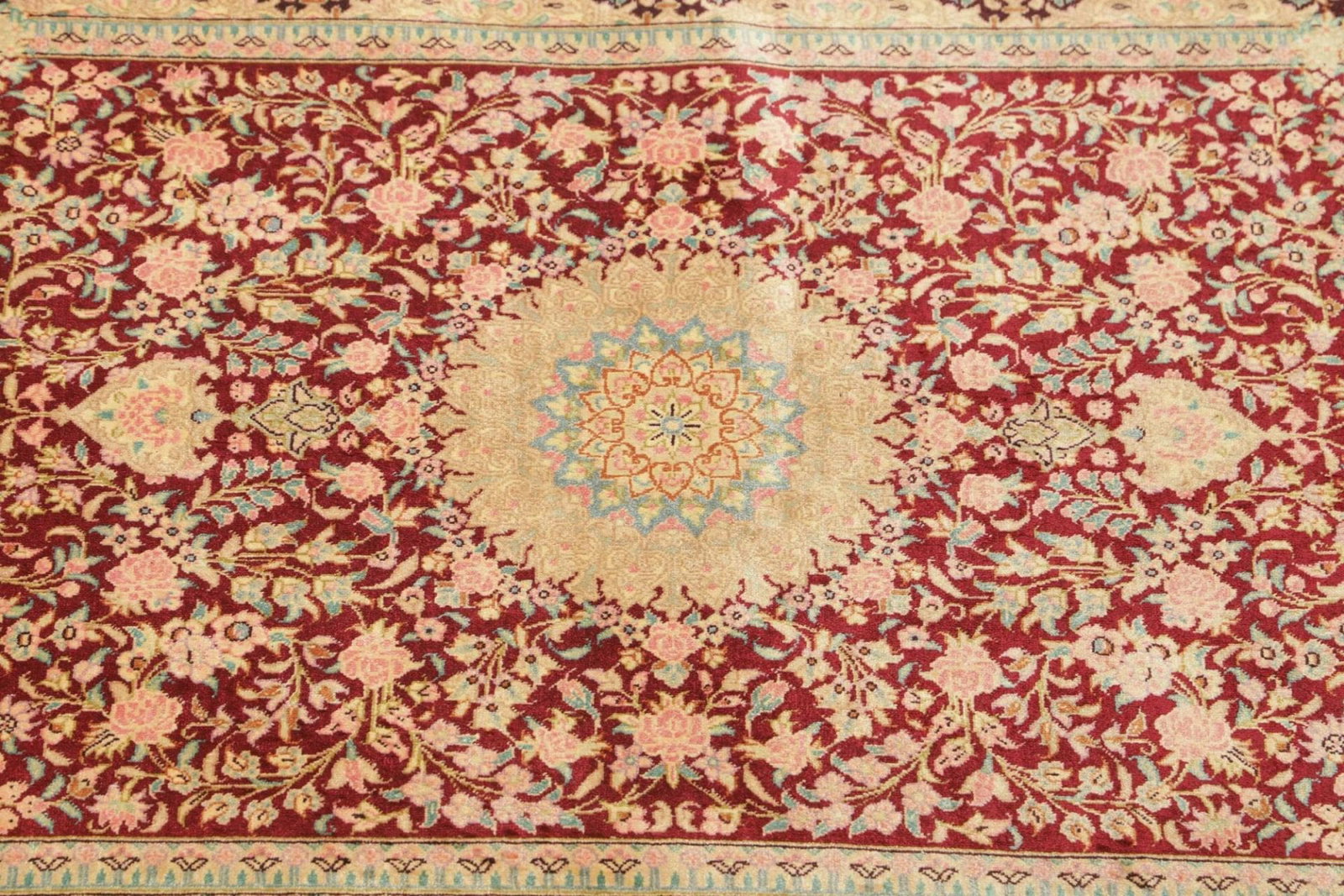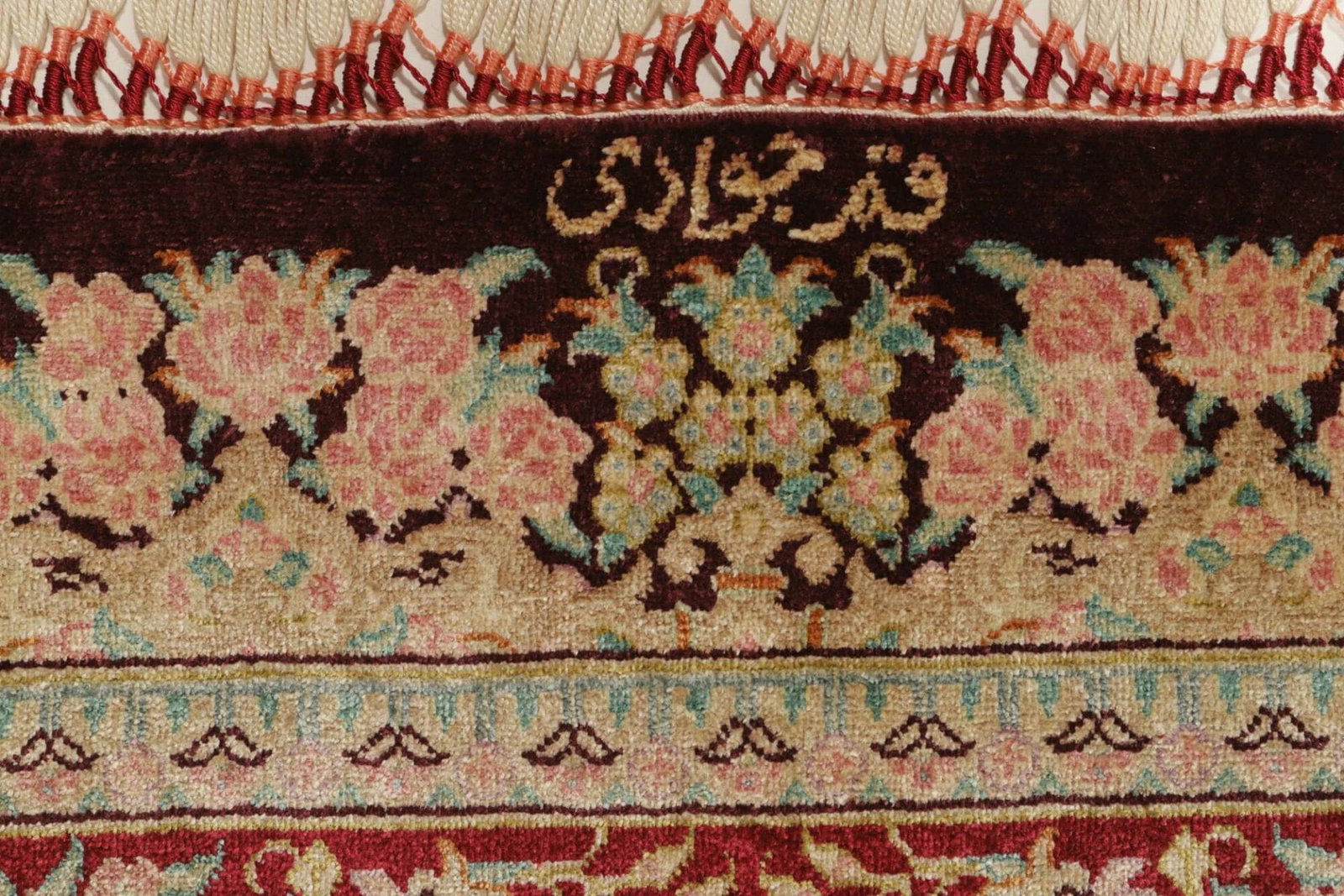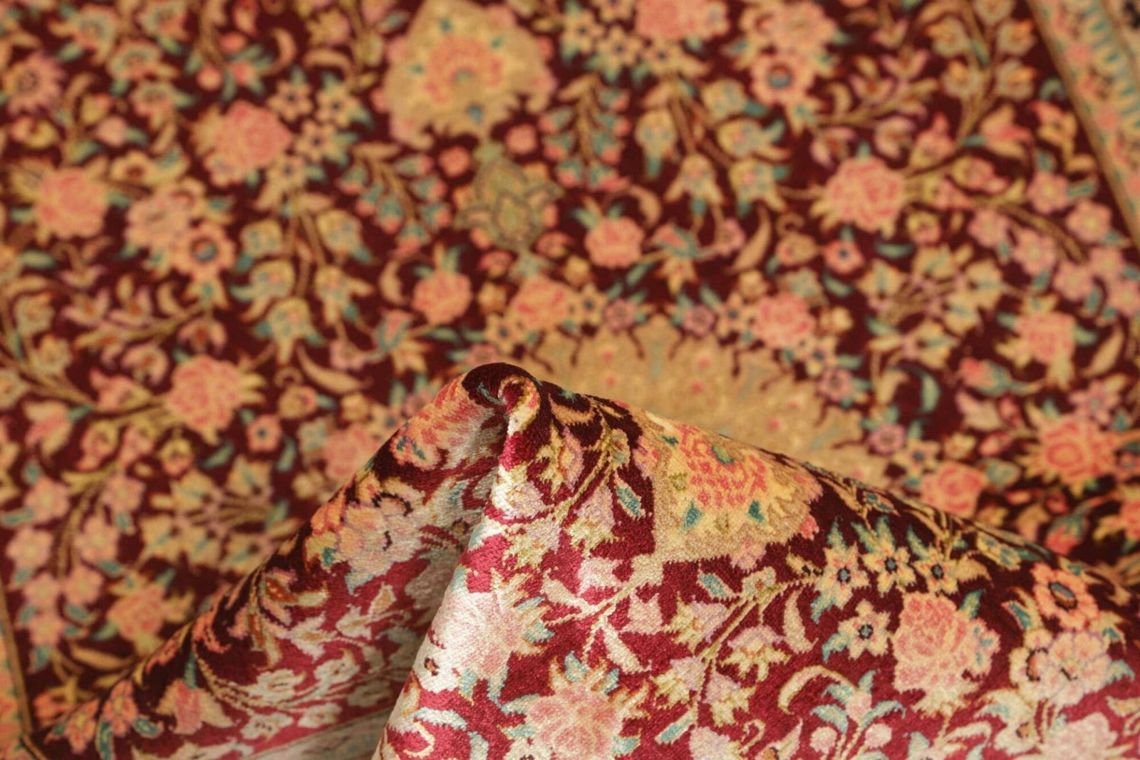 3313$Ursprünglicher Preis war: 3313$2937$Aktueller Preis ist: 2937$Handgeknüpfter Ghom Teppich | Knotendichte: ca. 900.000 Knoten/m² | Material: 100% Seide | Größe: 62 x 89 cm | In ausgezeichnetem Zustand | Herkunft: Iran | Florhöhe: ca. 4 mm