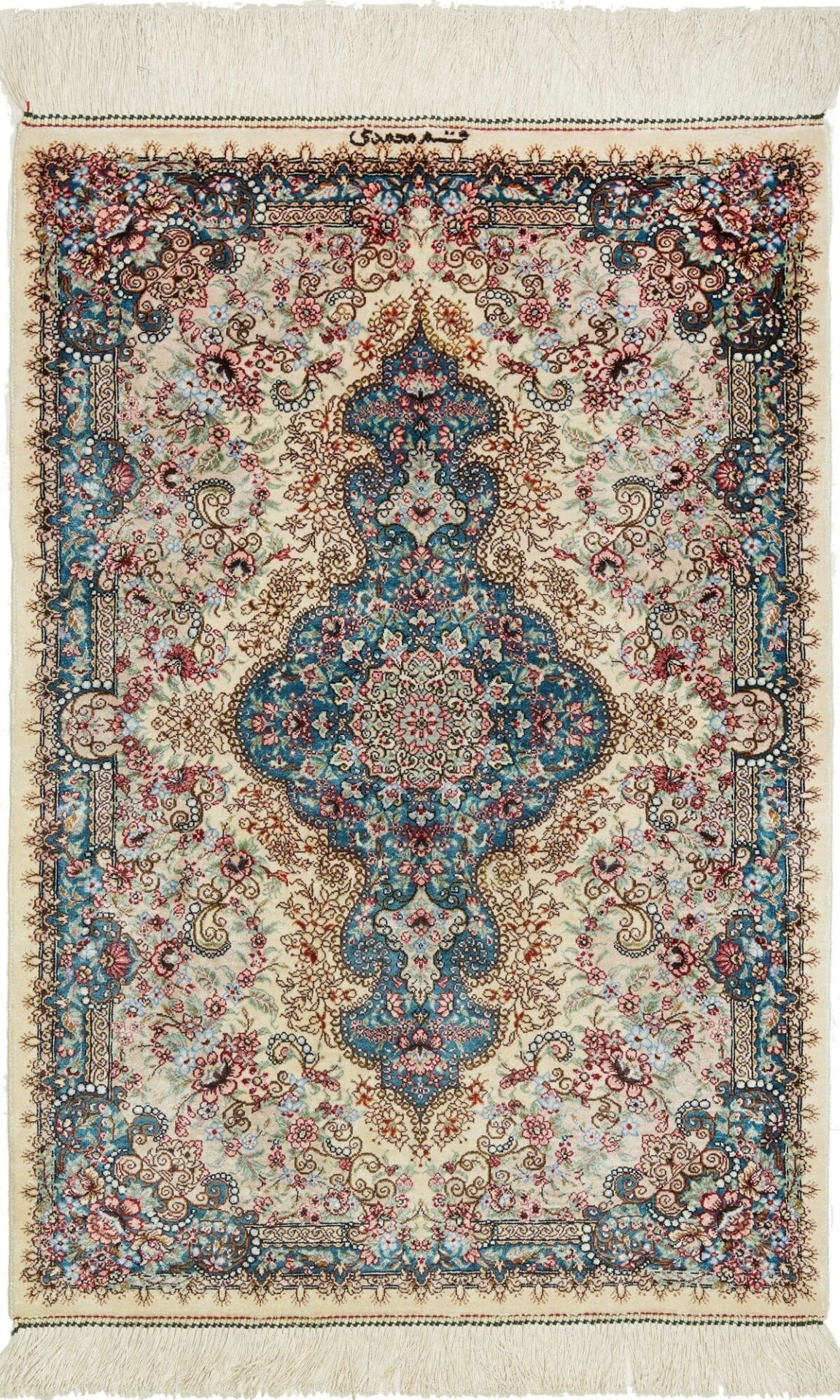 3313$Ursprünglicher Preis war: 3313$2774$Aktueller Preis ist: 2774$Handgeknüpfter Ghom Teppich | Knotendichte: ca. 900.000 Knoten/m² | Material: 100% Seide (Flor und Kette) | Größe: 62 x 90 cm | Herkunft: Iran | Höhe: ca. 4 mm | Exklusive und edle Ausstrahlung