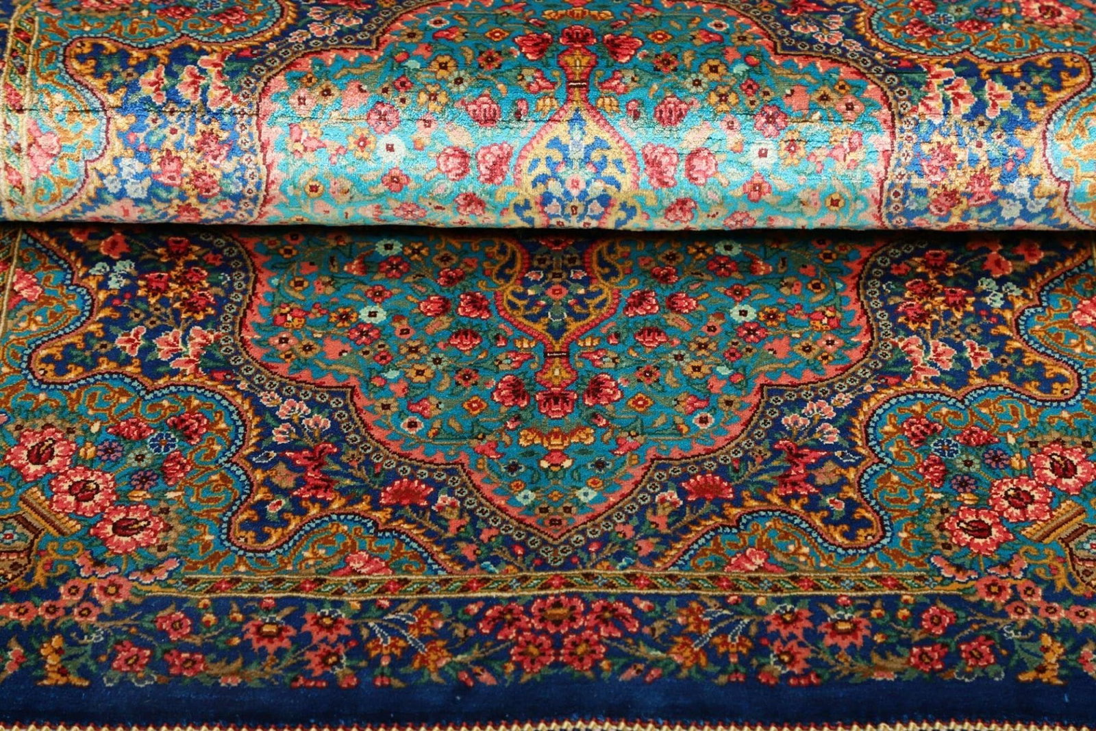 Hergestellt aus edelster Seide, besticht der Ghom Teppich durch seine sanfte und geschmeidige Textur sowie durch einen unvergleichlichen Glanz. Seide wird traditionell für Teppiche verwendet, die sowohl zur Verschönerung des Raumes als auch als wertvolles Sammlerstück dienen. Die Feinheit der Seide ermöglicht es, äußerst präzise und feine Muster zu kreieren, die diesem Teppich eine besondere Ausstrahlung verleihen. Die hohe Knotendichte sorgt dafür, dass der Teppich nicht nur ästhetisch ansprechend ist, sondern auch langlebig und widerstandsfähig gegenüber Abnutzungen, die im Alltag auftreten können.
