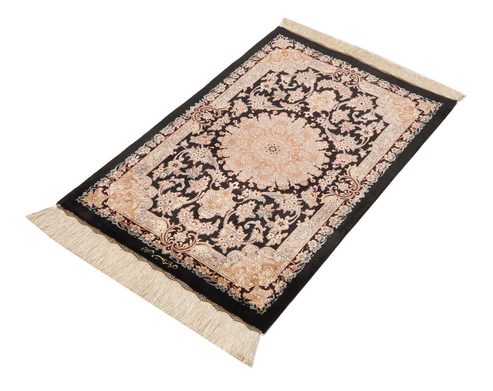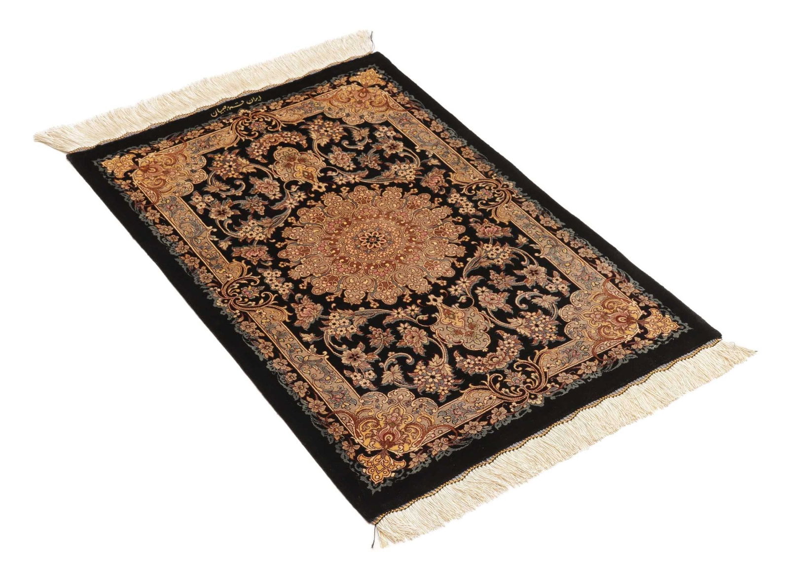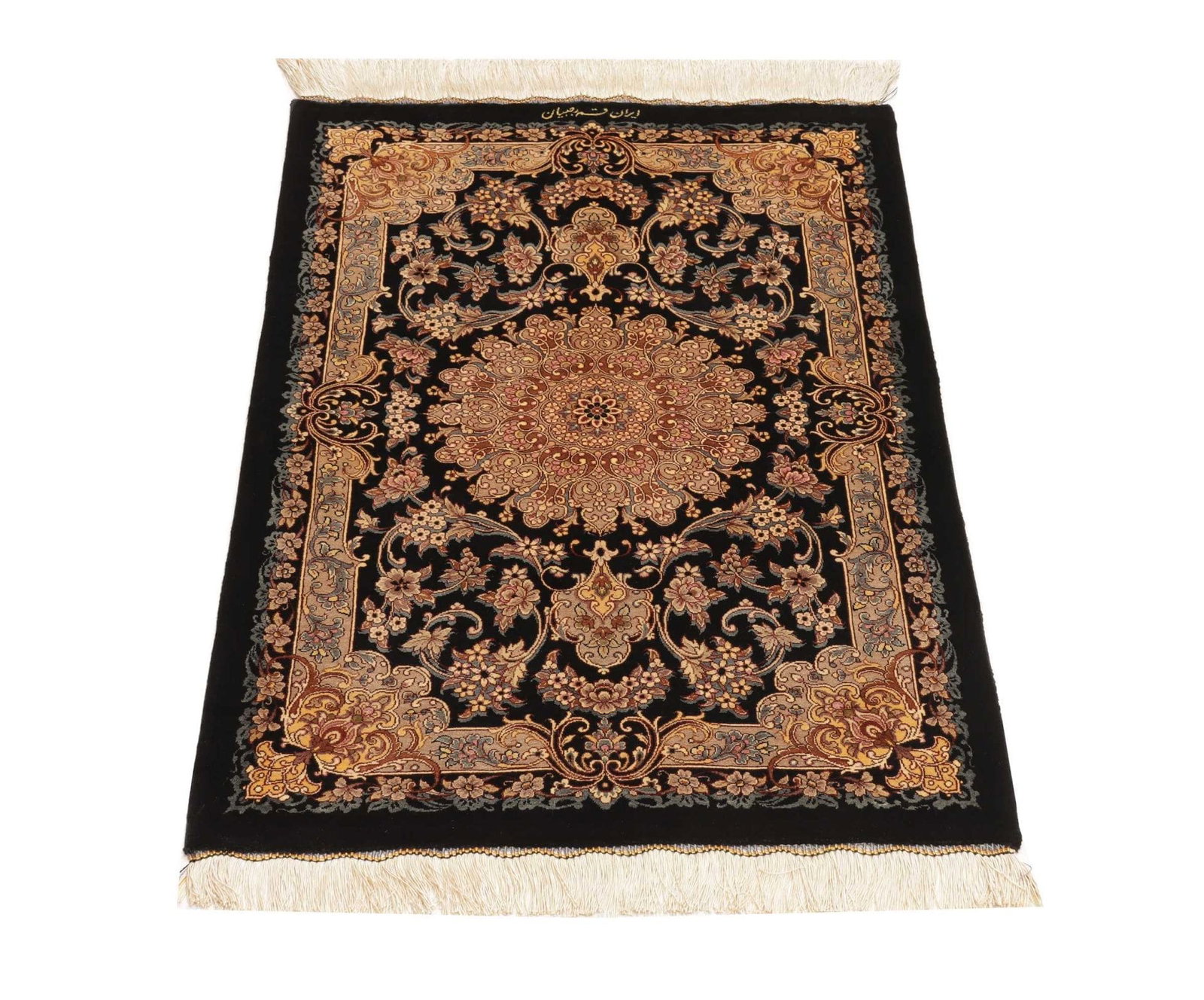 | Ghom Teppich | Knotendichte: ca. 900.000 Knoten/m² | Material: 100% Seide | Größe: 65×90 cm | In ausgezeichnetem Zustand | Handgeknüpfte Qualität | Herkunft: Iran | Florhöhe: ca. 4mm | Exklusive florale und geometrische Muster |