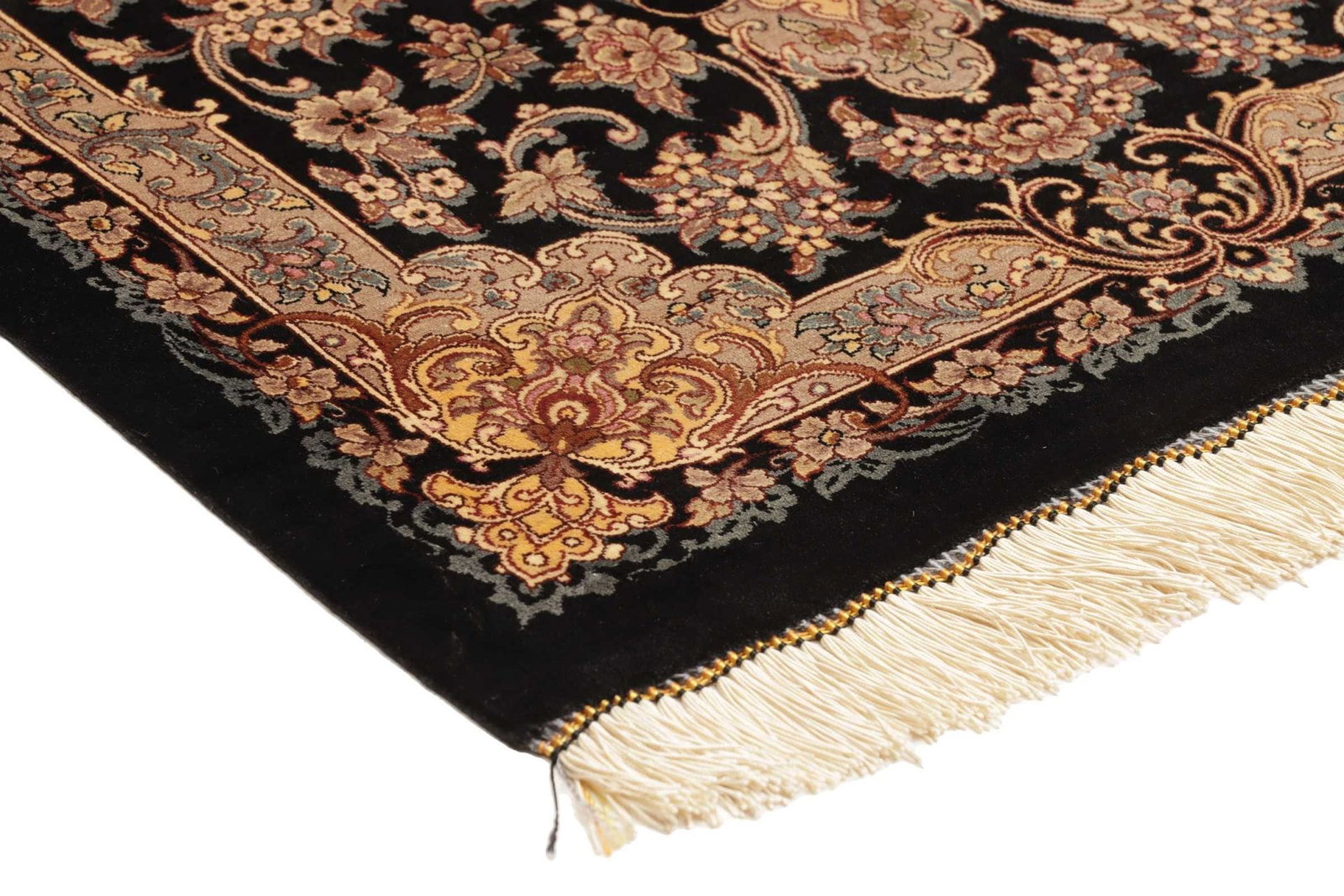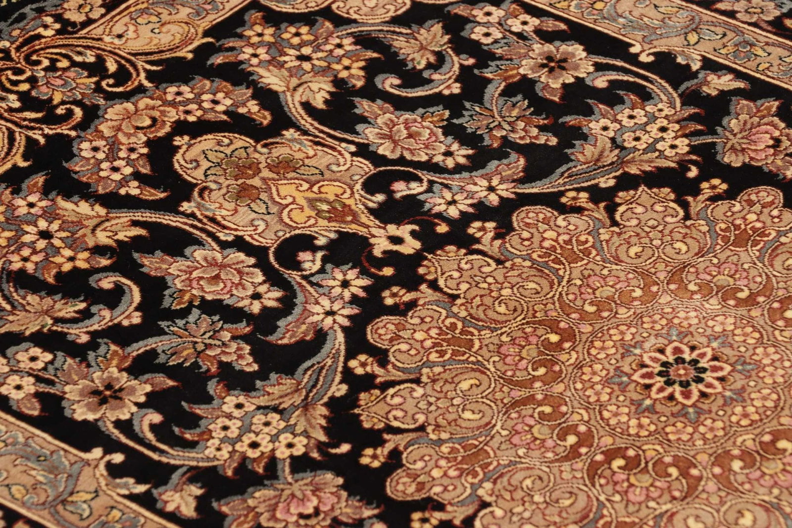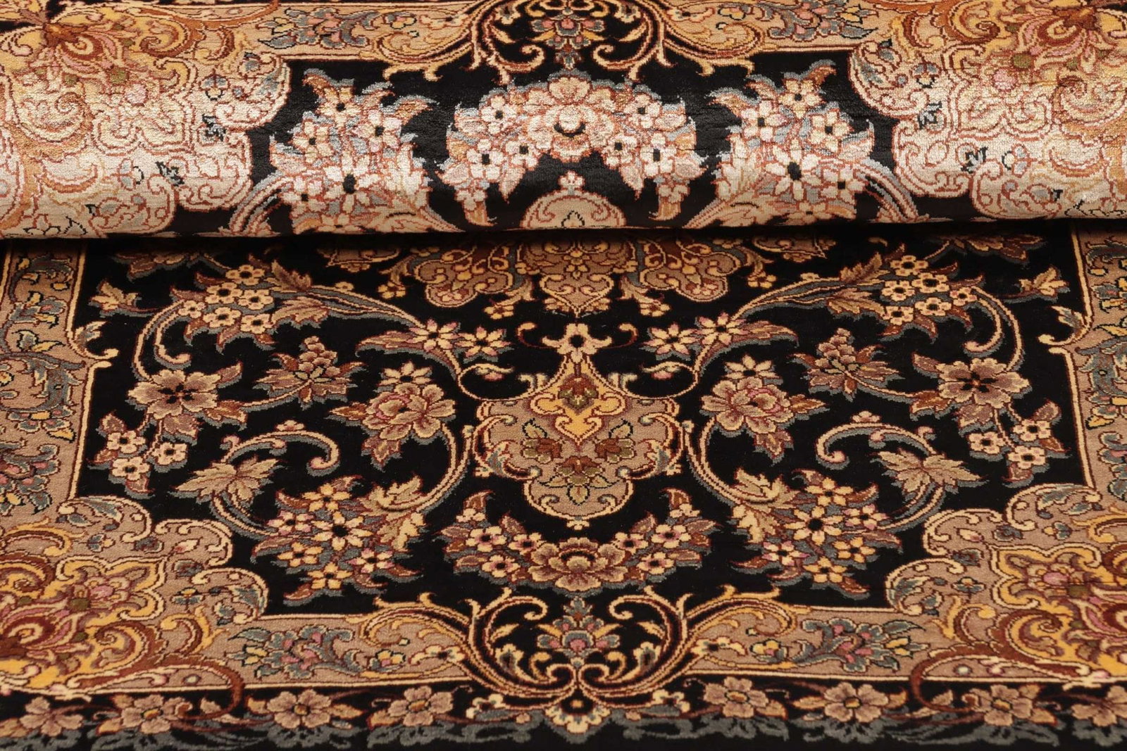 Der Ghom Teppich wird aus hochwertiger Seide gefertigt, die für ihre Langlebigkeit und ihren Glanz bekannt ist. Seidentepiche sind besonders geschätzt, da sie farbintensive Designs bieten und gleichzeitig eine erstaunliche Feinheit aufweisen. Die Knotendichte dieses Teppichs ist ein weiteres Highlight. Hohe Knotendichte sorgt dafür, dass die Details der floralen Muster klar definiert und stabil sind, was die Langlebigkeit und Robustheit des Teppichs unterstreicht.