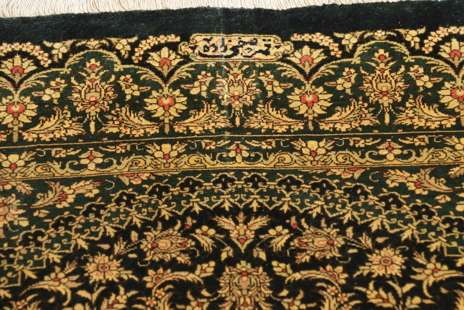 Wesentliche Merkmale dieses Teppichs sind die hochwertigen Materialien, die außergewöhnliche Knotendichte und die meisterhafte Verarbeitung. Der Teppich wurde aus edelster Seide knüpft, die für ihre Leuchtkraft und ihren feinen Glanz bekannt ist. Diese Eigenschaften machen den Teppich nicht nur zu einem stilvollen Dekorationsstück, sondern auch zu einer nachhaltigen Investition. Die hohe Knotenzahl garantiert ein langlebiges und robustes Produkt, das auch nach Jahren der Nutzung seine Schönheit bewahrt.