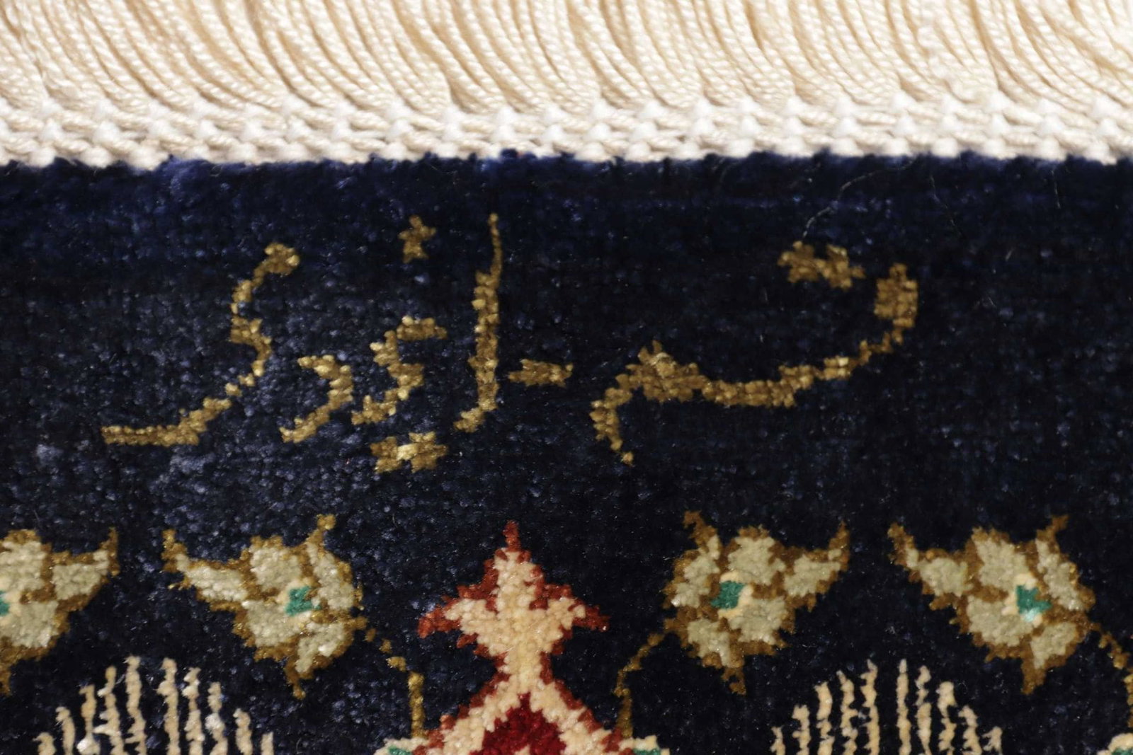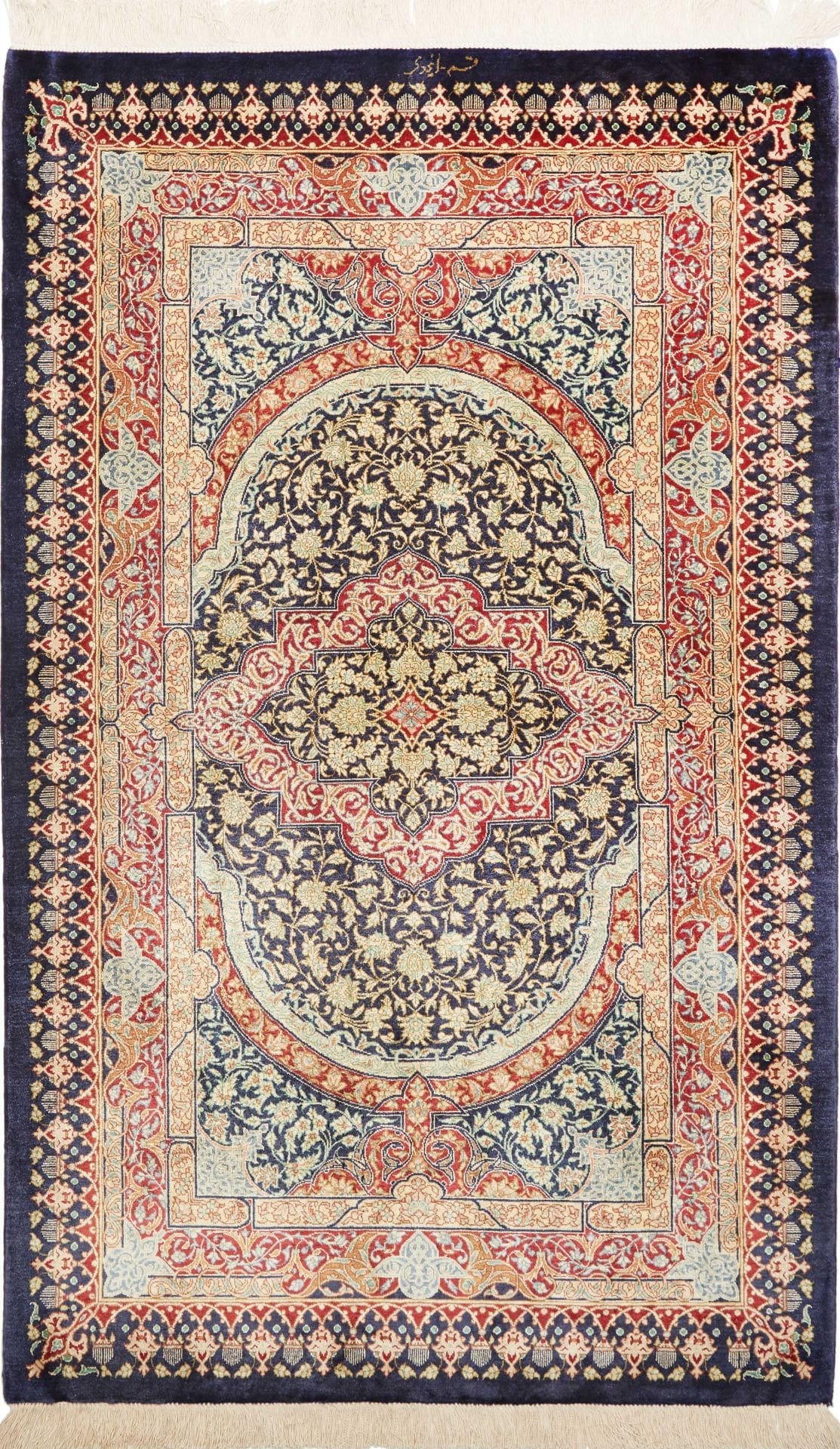 | Ghom Teppich | Knotendichte: ca. 900.000 Knoten/m² | Material: 100% Seide | Größe: 80×123 cm | In ausgezeichnetem Zustand | Herkunft: Iran | Verarbeitung: Handgeknüpft | Florhöhe: ca. 4mm |